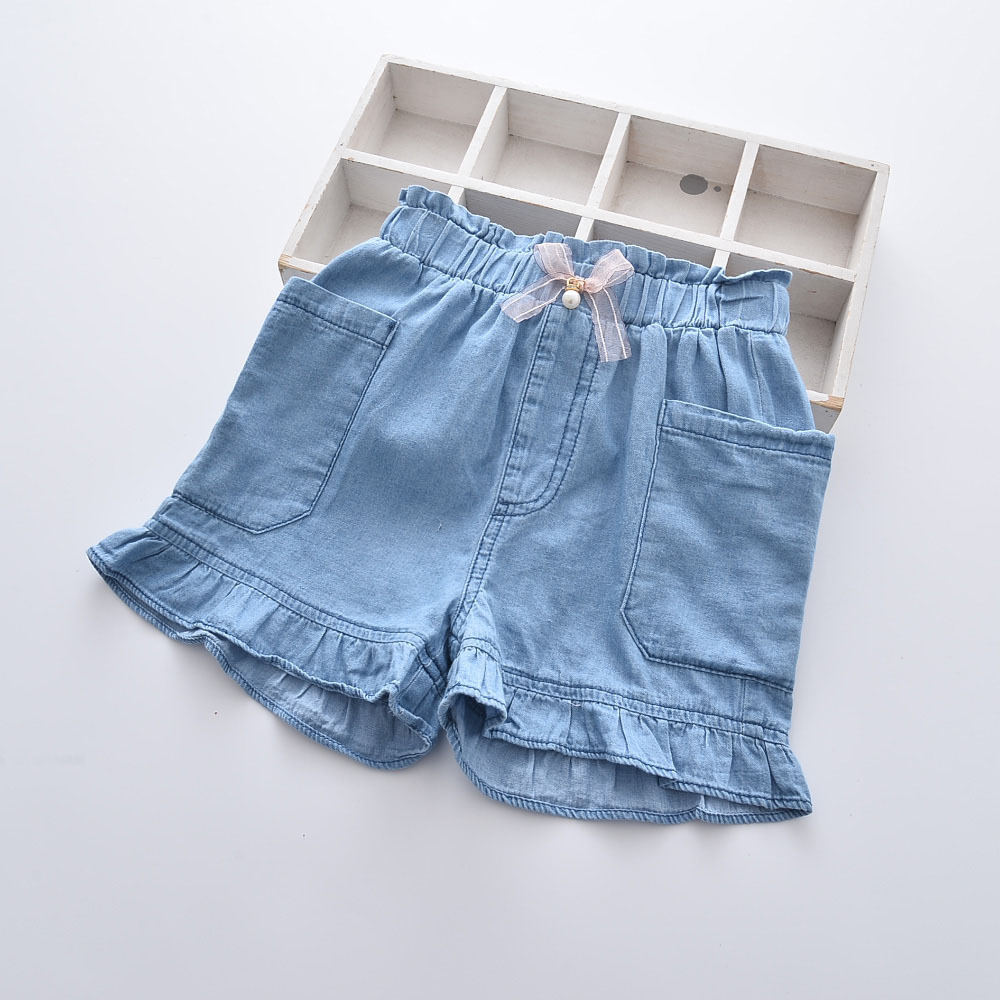 2021夏季新款 珍珠蝴蝶结 女童松紧腰花边牛仔短裤