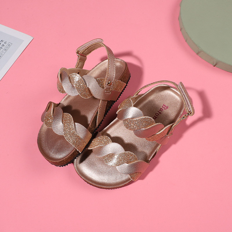 여자 학생을위한 여자 샌들 2024 새로운 여름 어린 소녀 플랫 바닥 코르크 어린이 해변 신발 도매스토어 가기