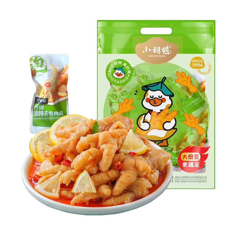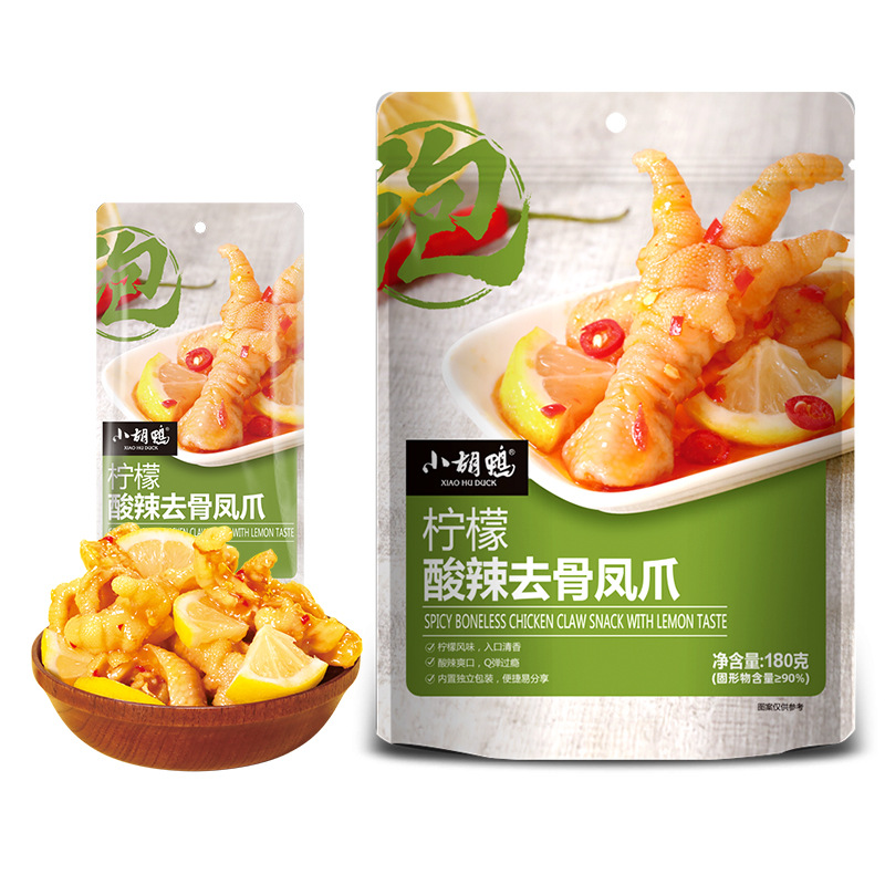 Xiaohu 오리 공장 도매 90g 소형 패키지 차가운 거품 신 레몬 뼈없는 닭 발톱 간식 뼈없는 닭 발톱