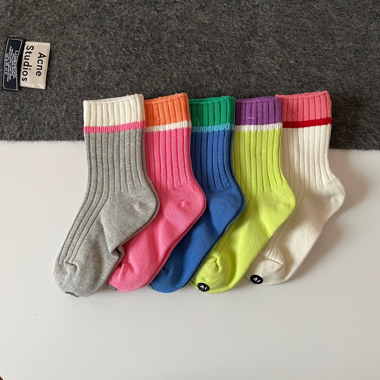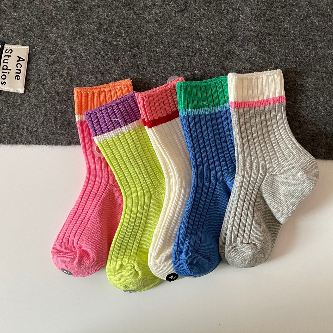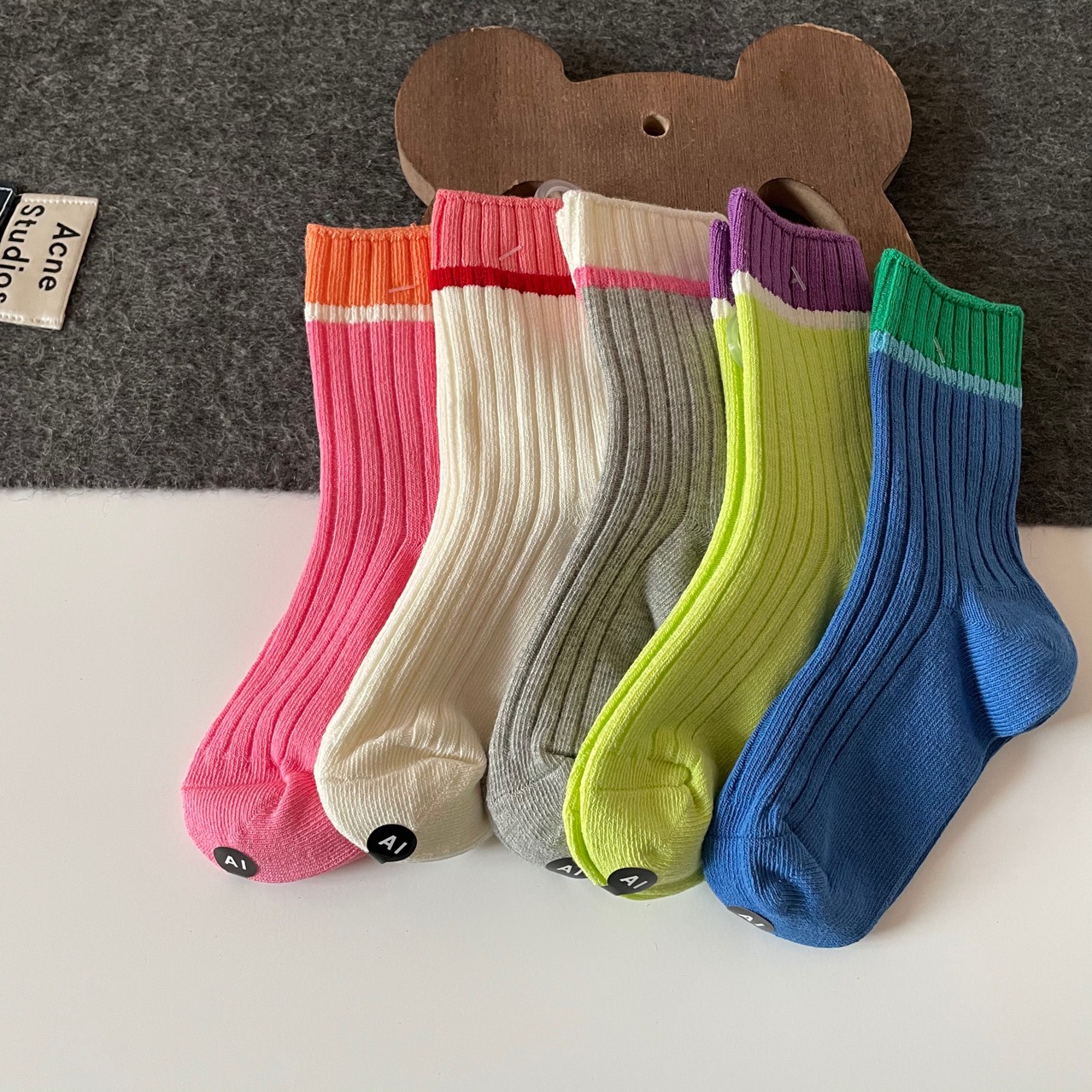 어린이 양말 면 사계절 양말 중간 길이 단색 배색 이중 바늘 제조업체 도매 부드럽고 통기성 좋은 땀 흡수 5켤레 유아용