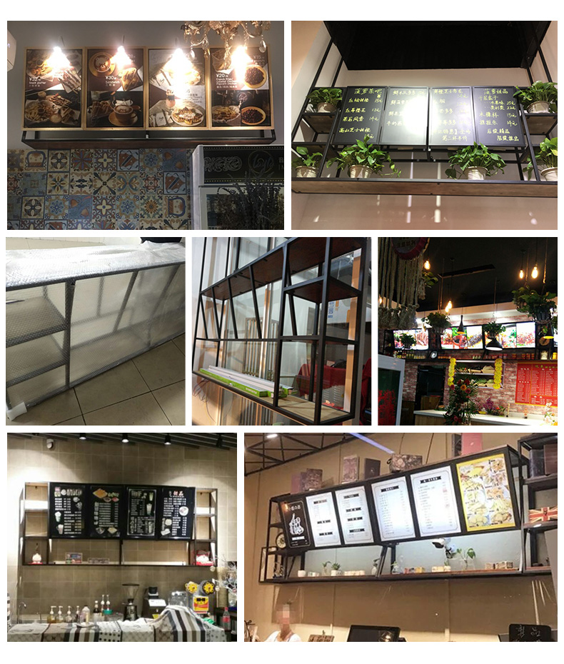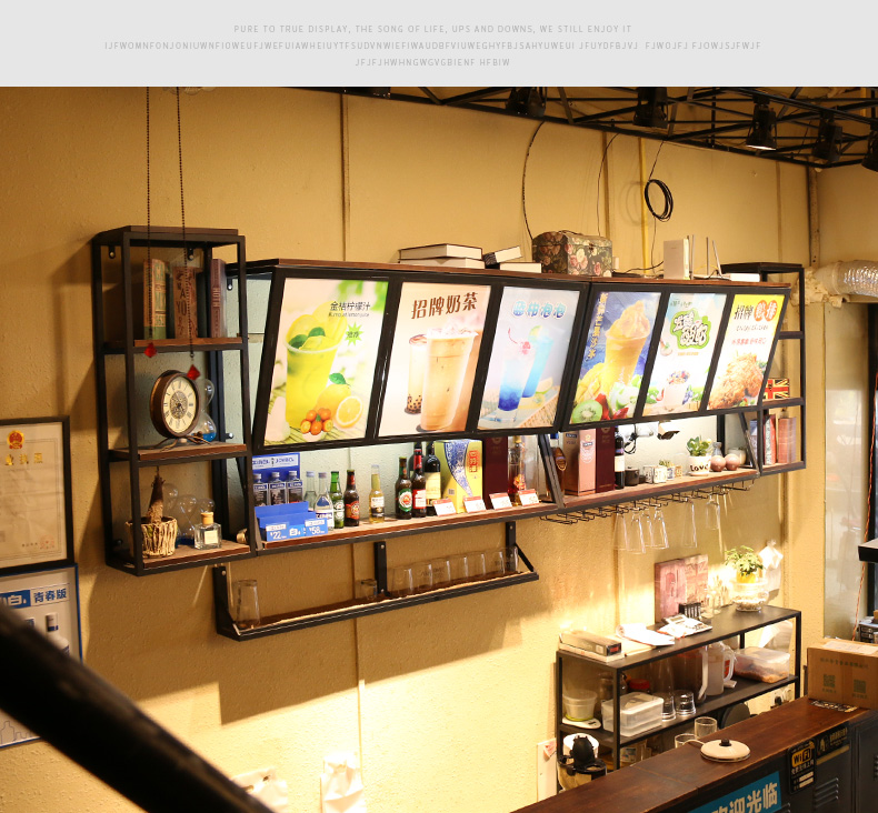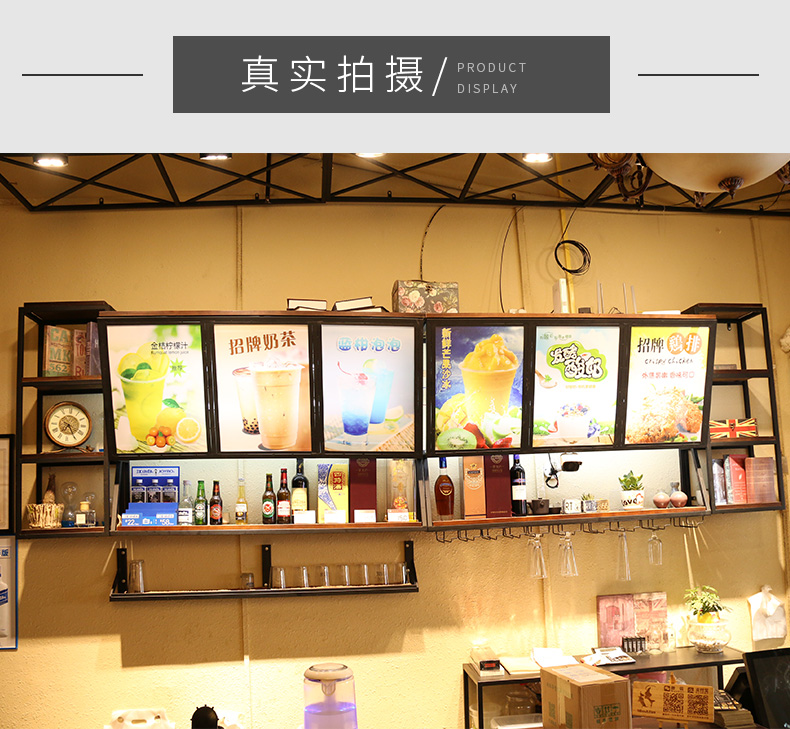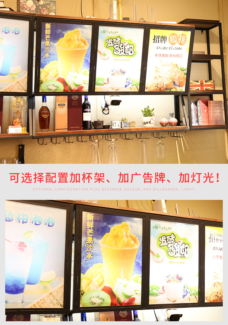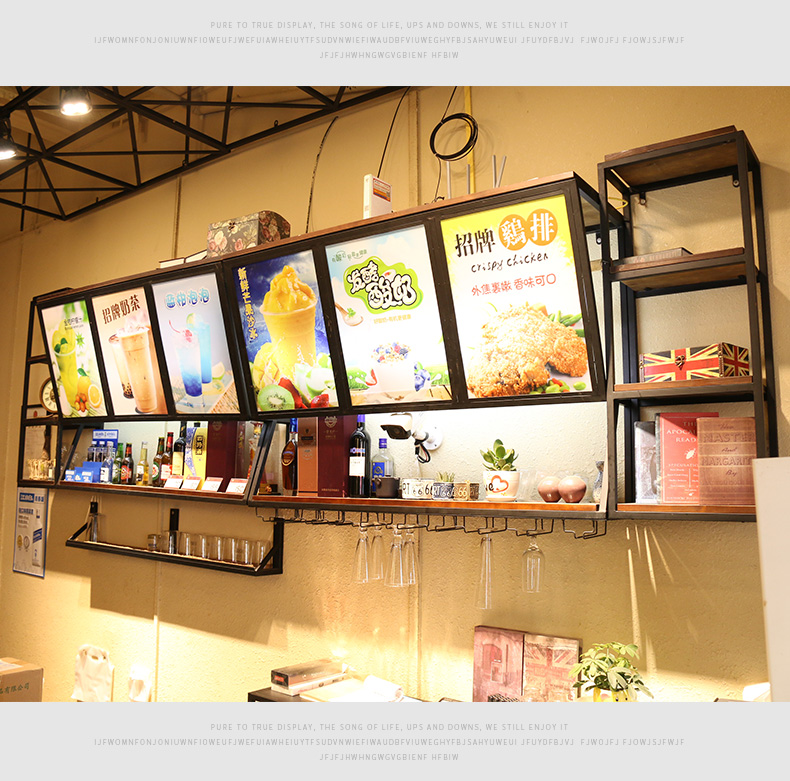 철 우유 차 상점 주문 라이트 박스 교수형 랙 바 캐비닛 레스토랑 장식 벽 교수형 메뉴 가격표 랙