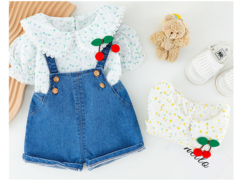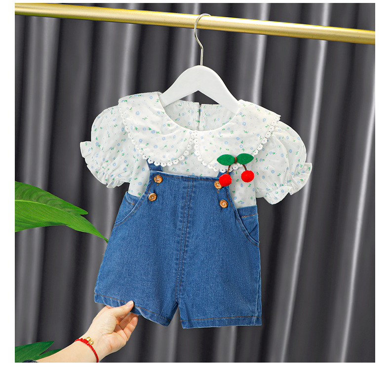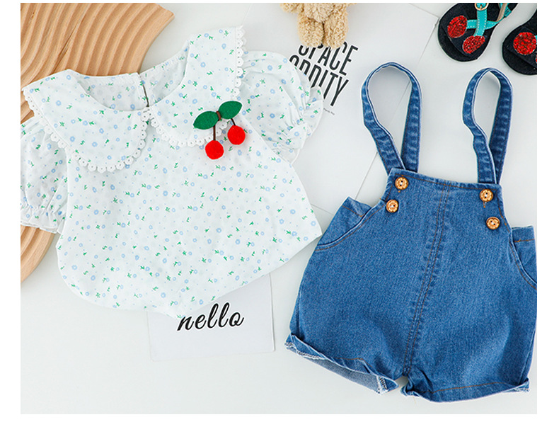 3118 여름 새로운 어린이 귀여운 꽃무늬 반팔 티셔츠 스트랩 반바지 어린이와 여성을위한 투피스 세트스토어 가기