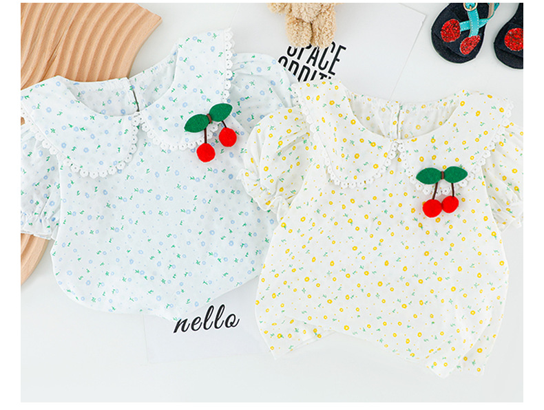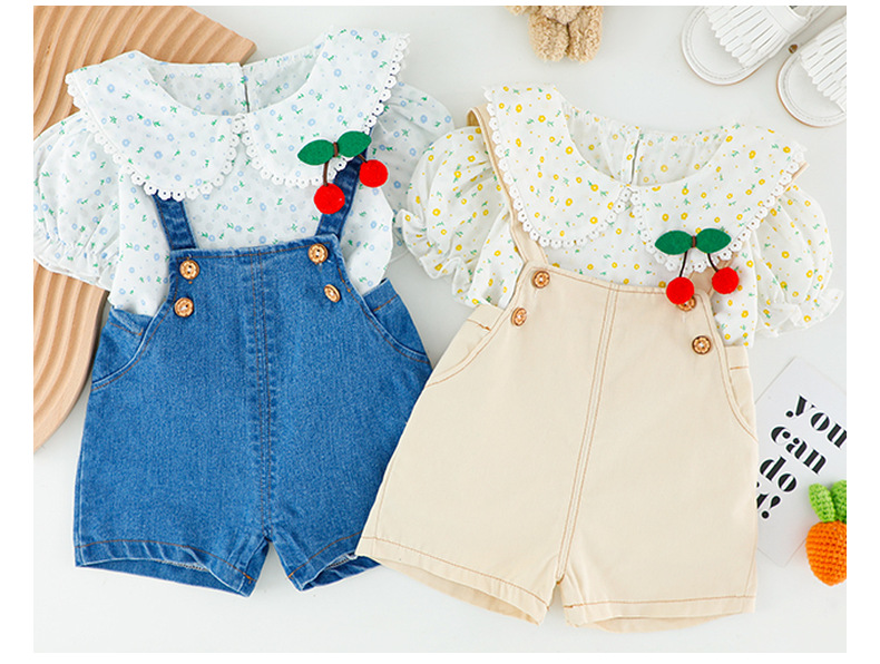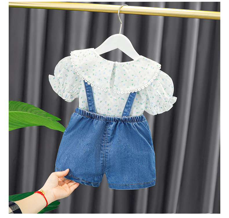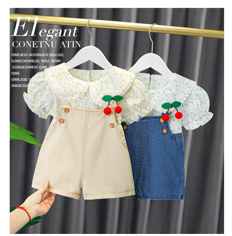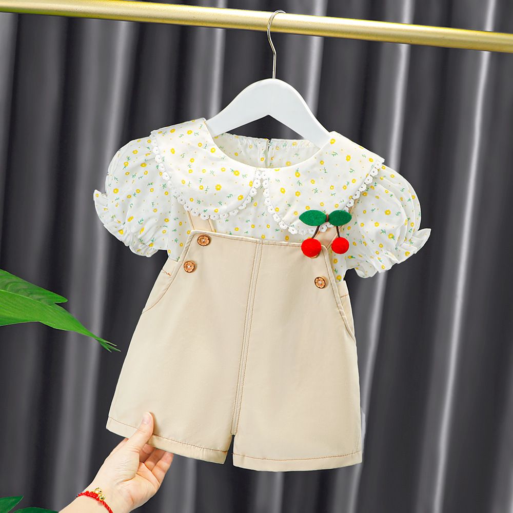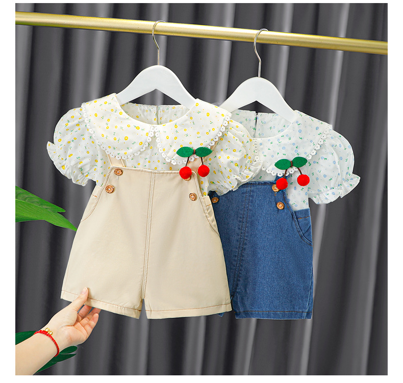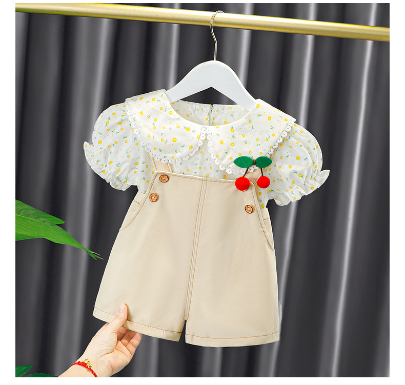 3118 여름 새로운 어린이 귀여운 꽃무늬 반팔 티셔츠 스트랩 반바지 어린이와 여성을위한 투피스 세트