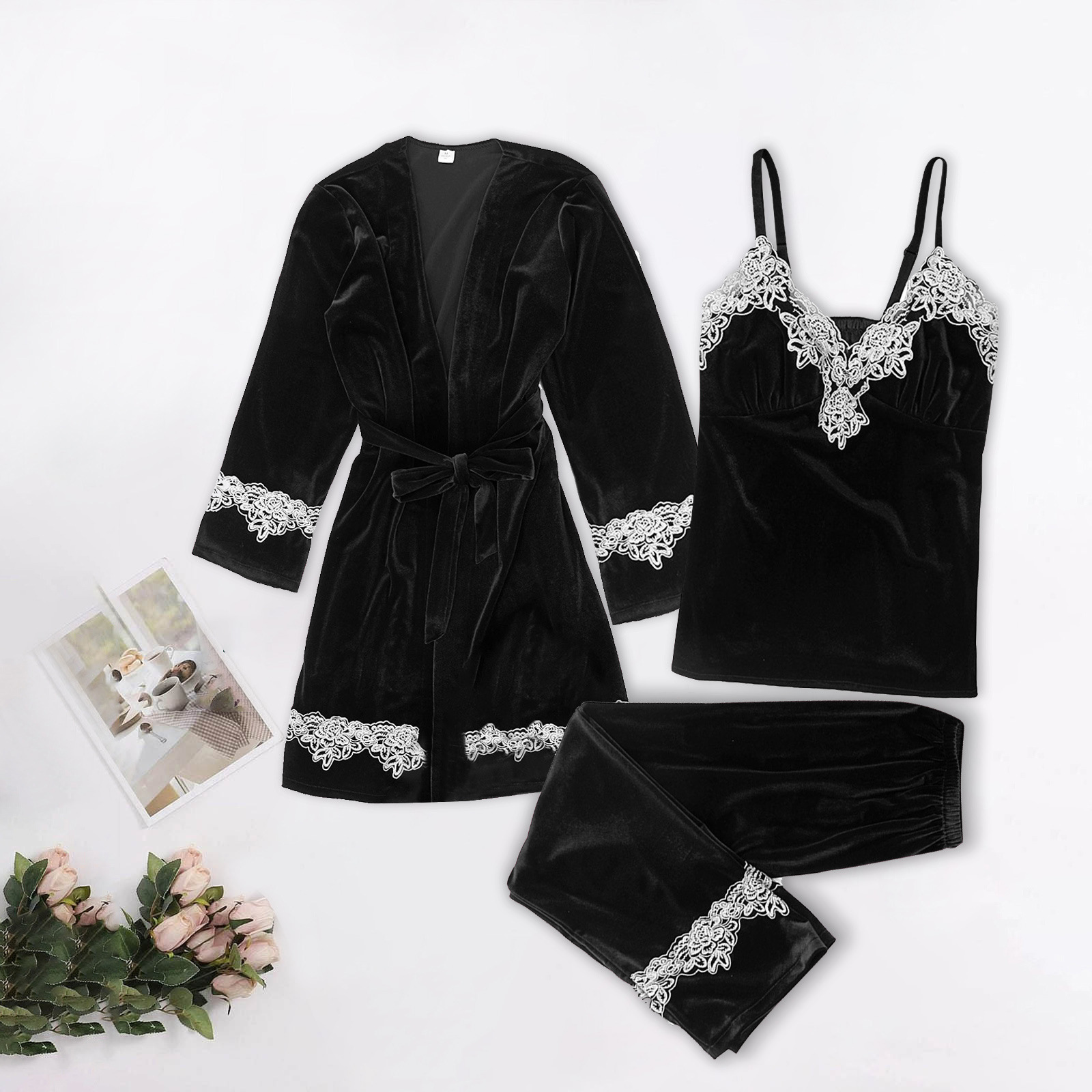 폭발의 세대 벨벳 3 피스 멜빵 바지 잠옷 세트 섹시한 속옷 잠옷 섹시한 여성의 가정 옷