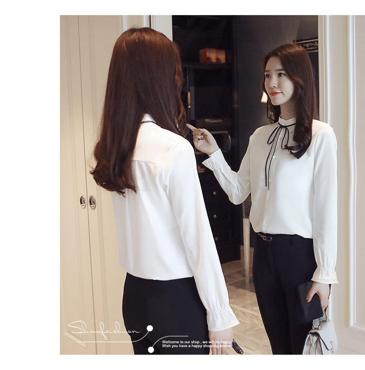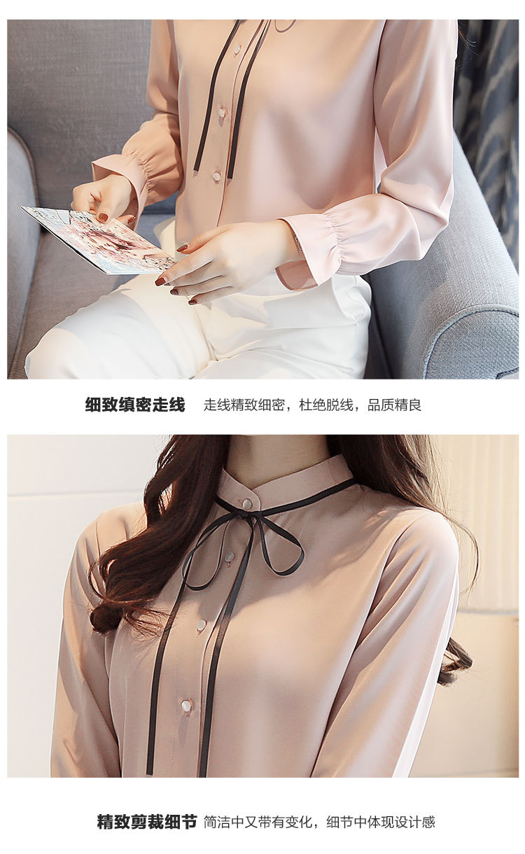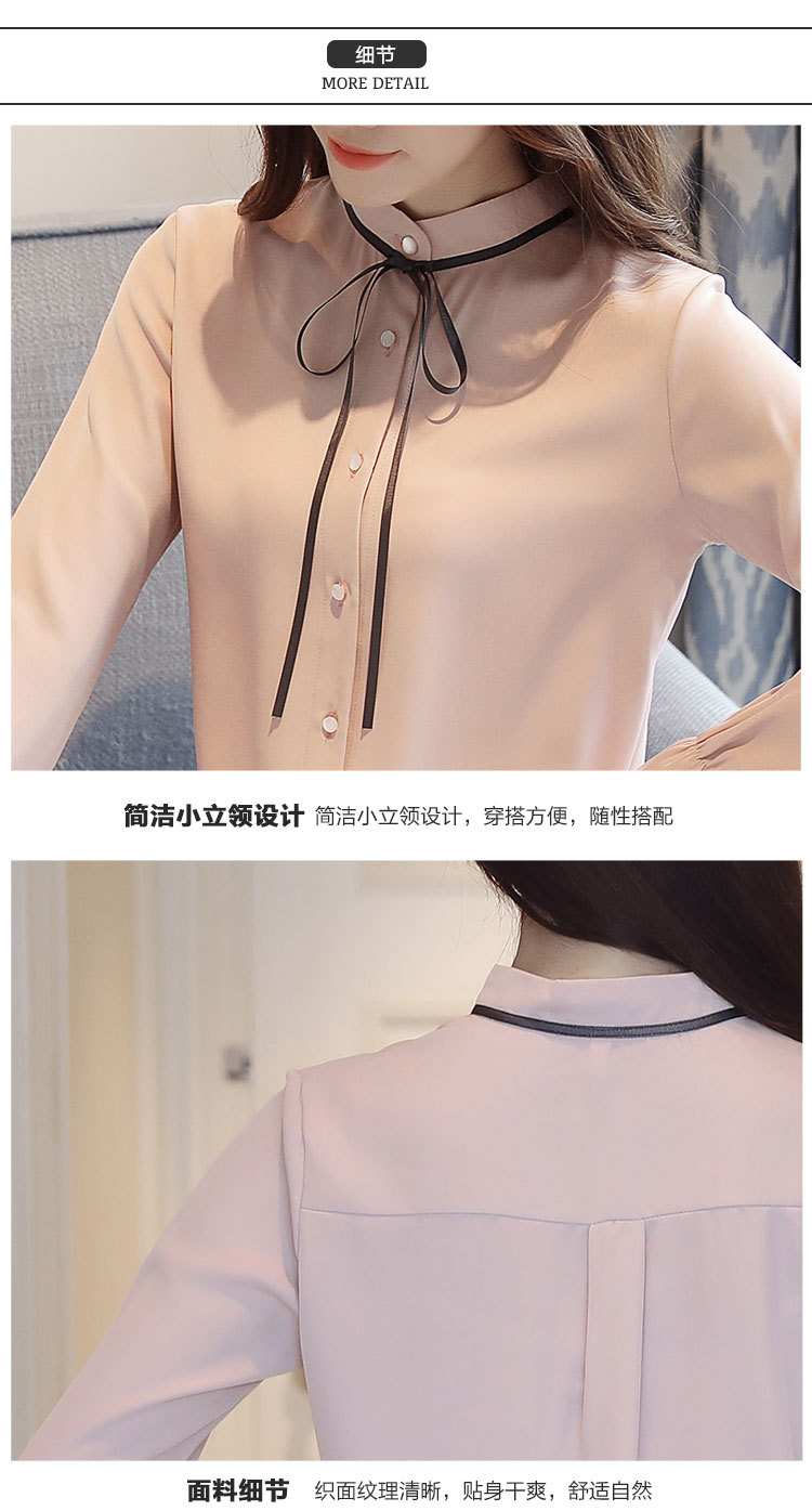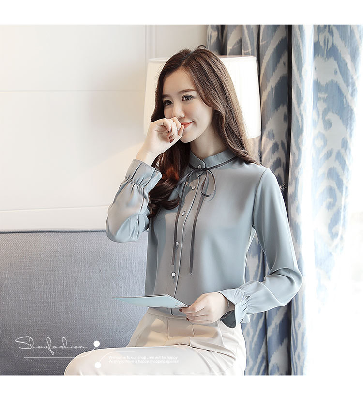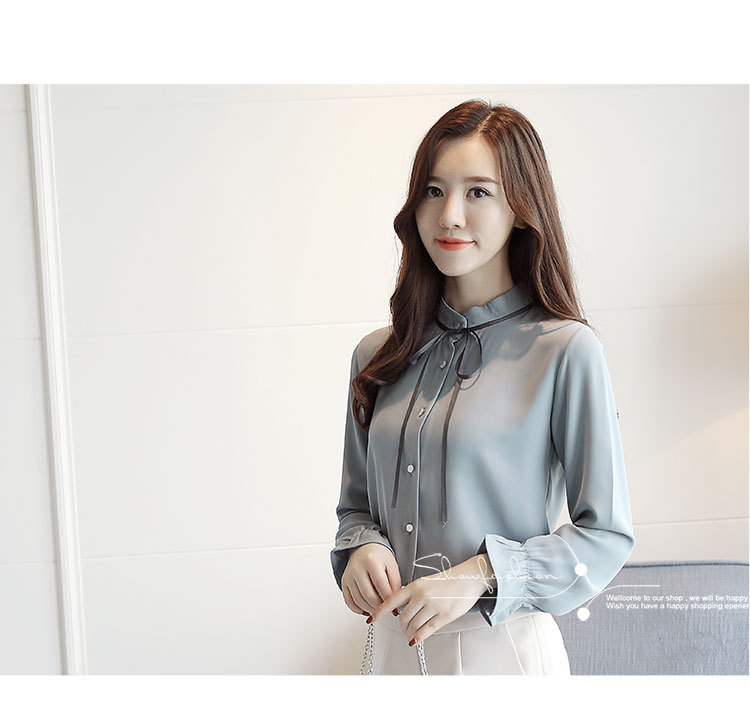 여성용 긴팔 쉬폰 셔츠, 2025 봄 가을 새로운 한국식 스탠드 칼라 얇은 스트랩 쉬폰 긴팔 디자인 셔츠 여성용스토어 가기