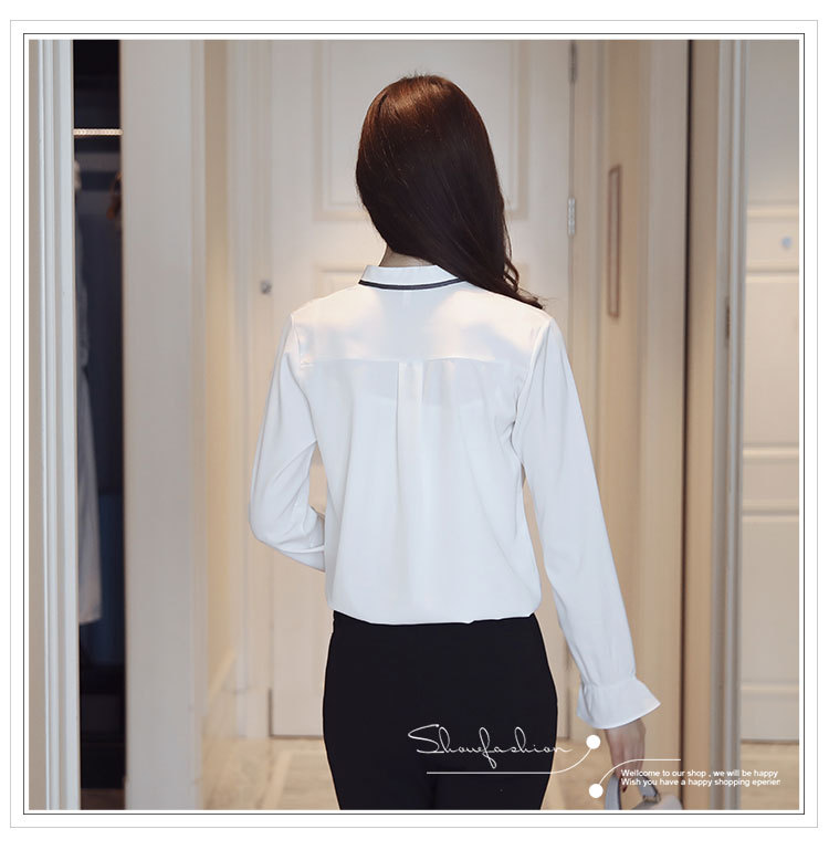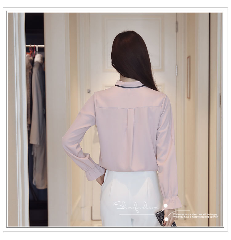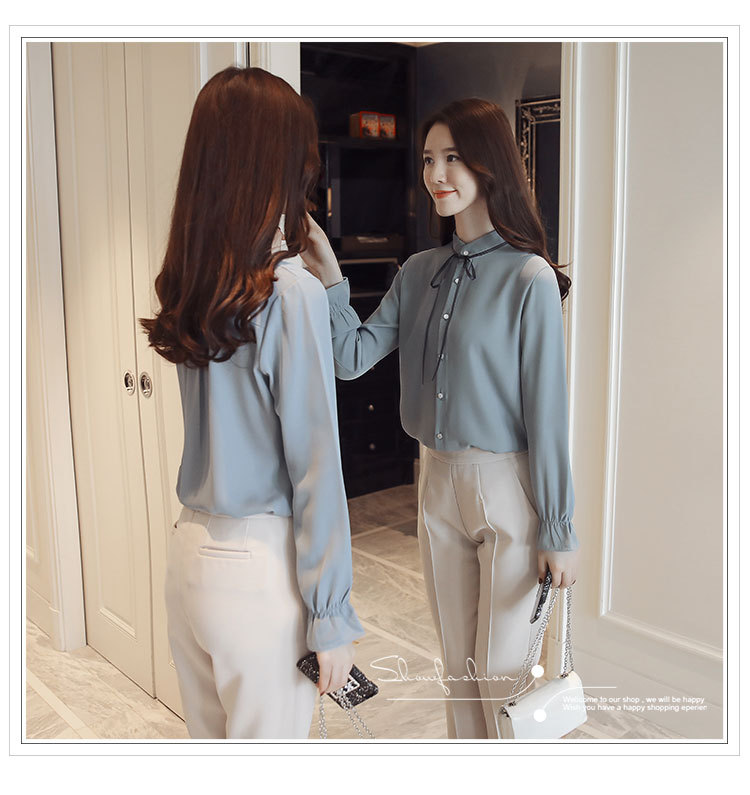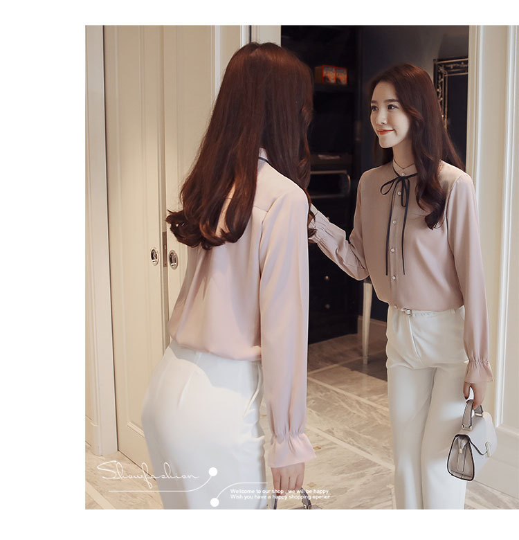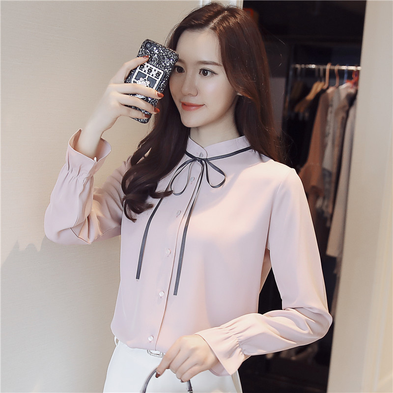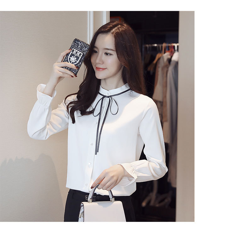 여성용 긴팔 쉬폰 셔츠, 2025 봄 가을 새로운 한국식 스탠드 칼라 얇은 스트랩 쉬폰 긴팔 디자인 셔츠 여성용스토어 가기