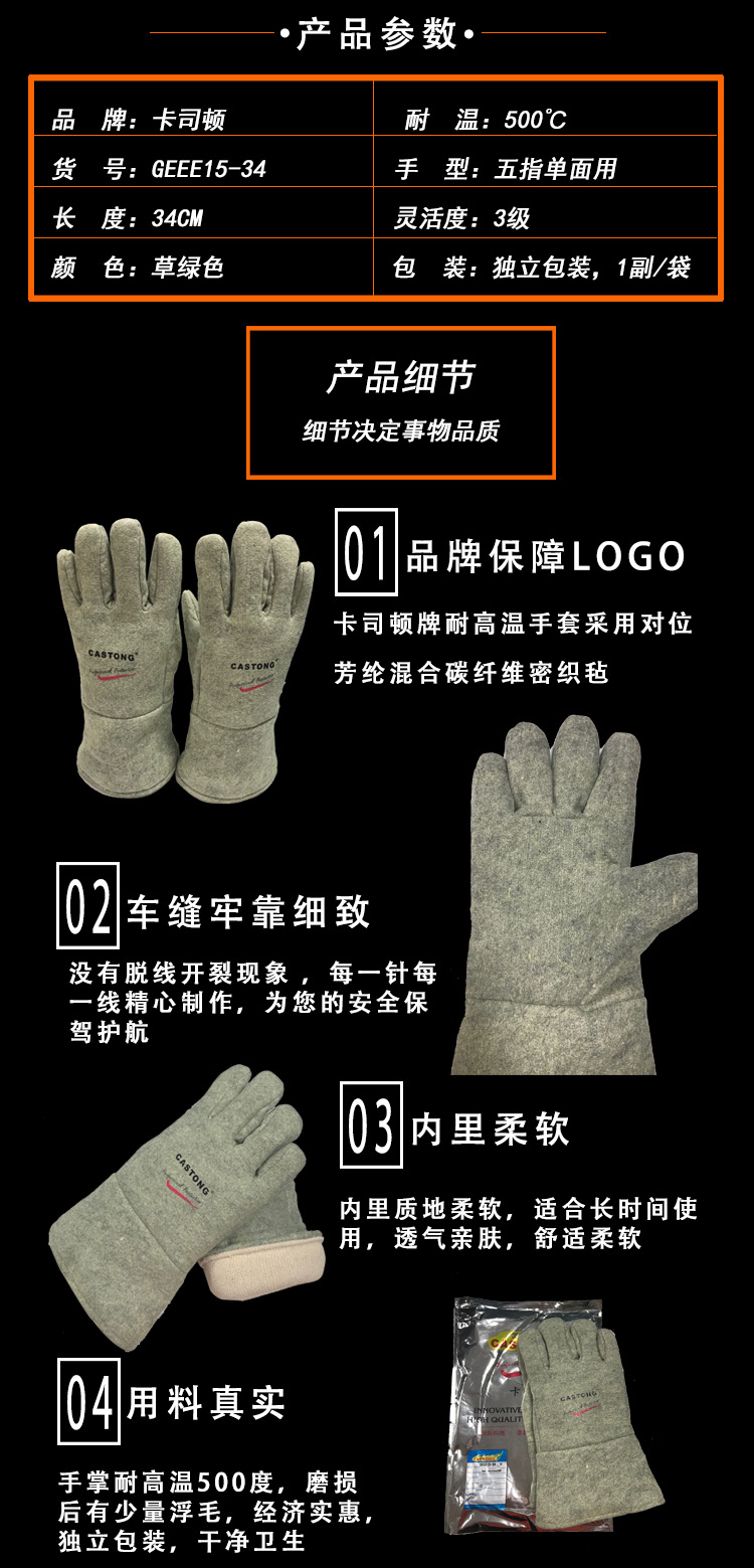 CASTONG Caston 500 도 고온 장갑 GEEE15-34 화상 방지 다섯 손가락 두꺼운 산업용 난연