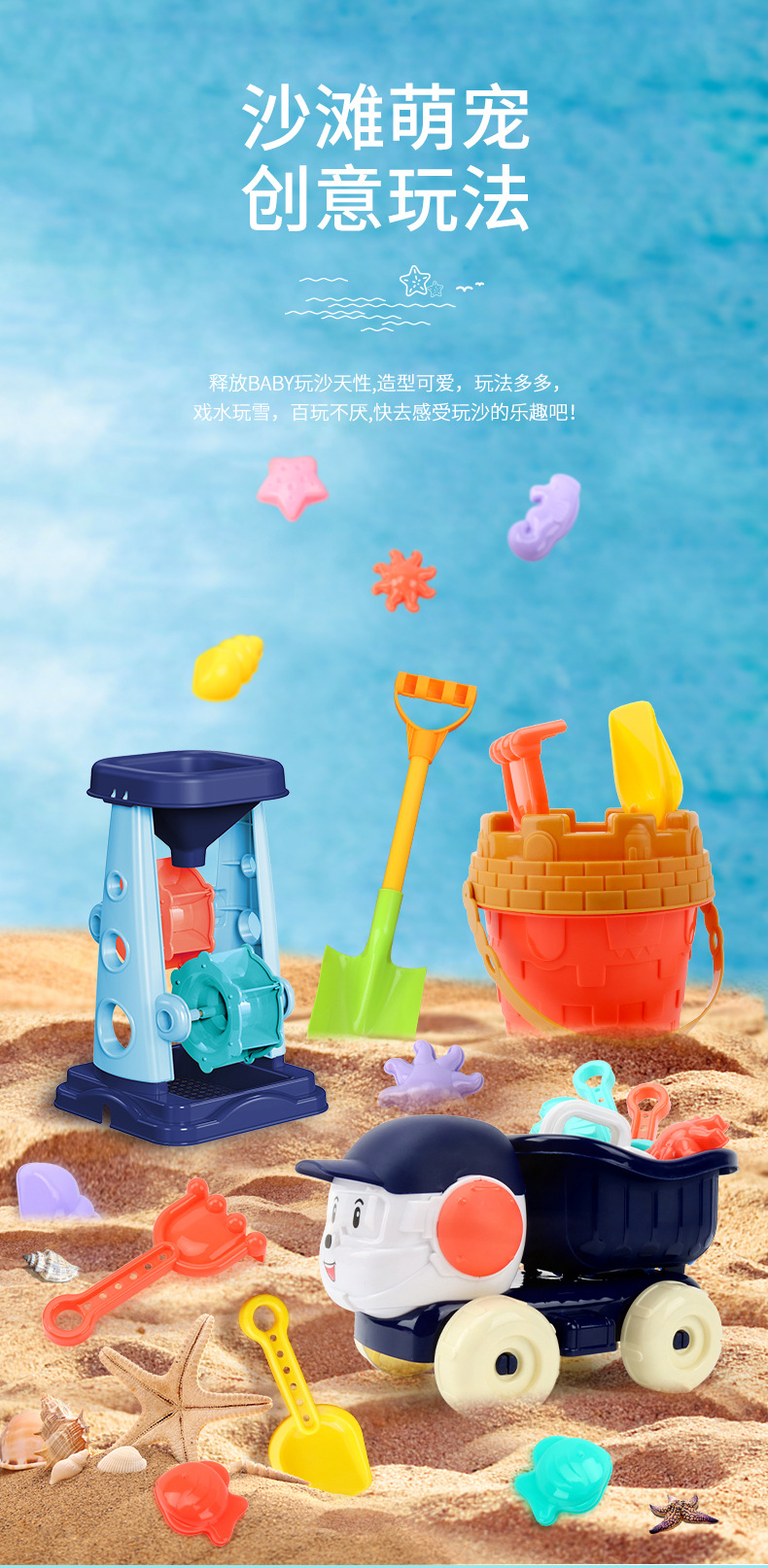 어린이 해변 장난감 세트 카트 모래 파기 삽과 양동이 도구 해변 모래 놀이 계수 나무 아기 모래 시계스토어 가기