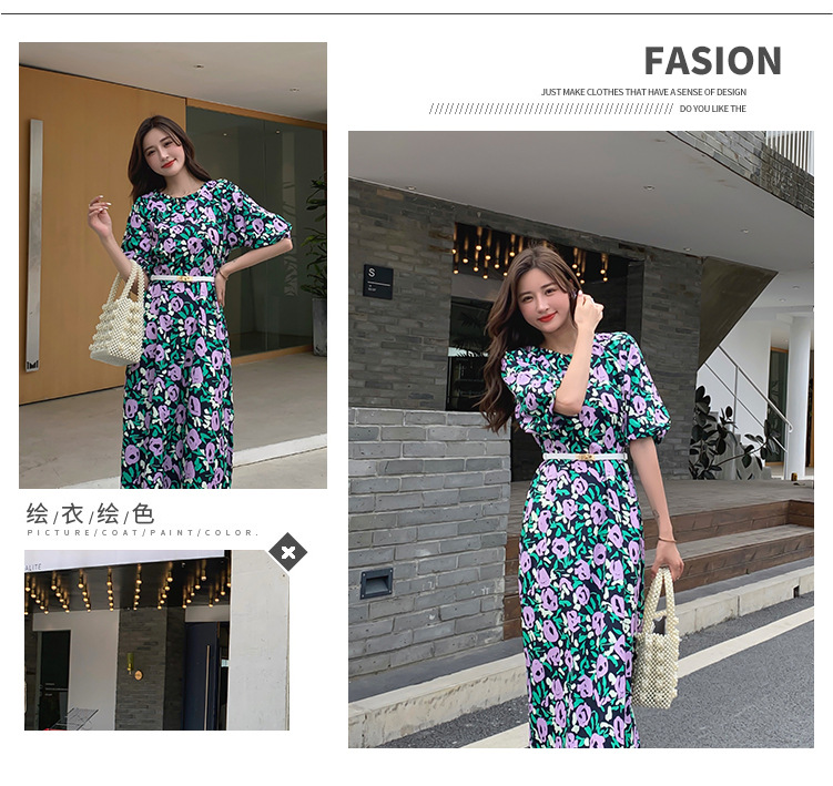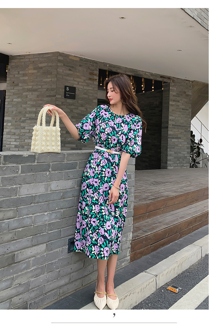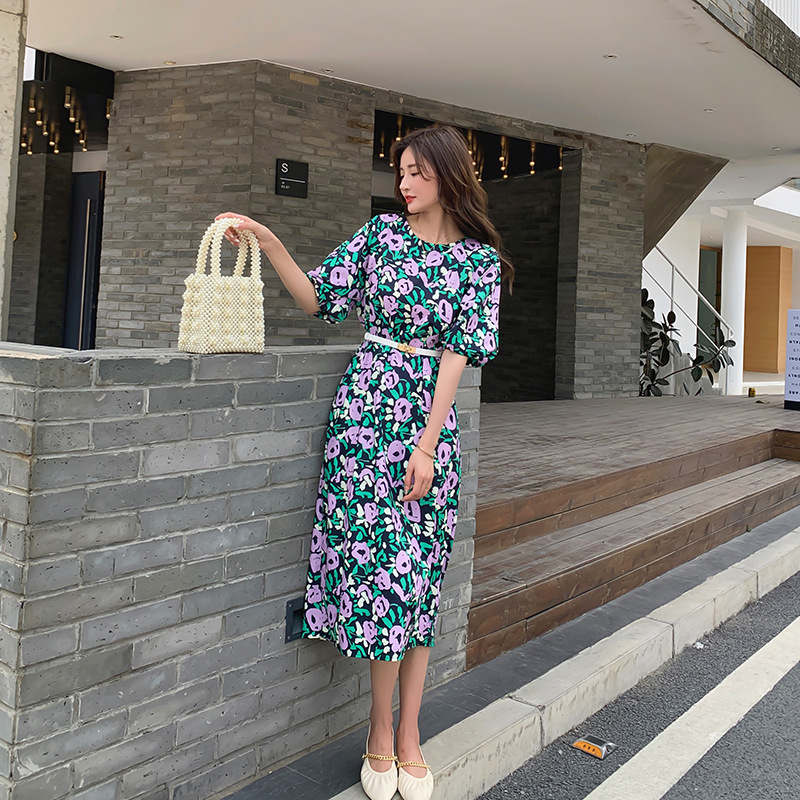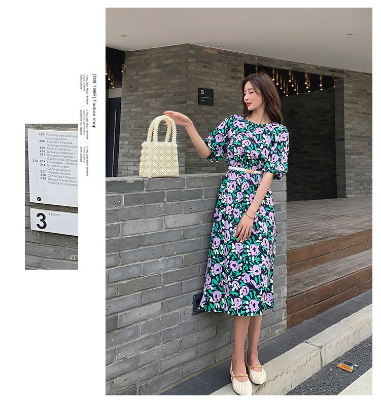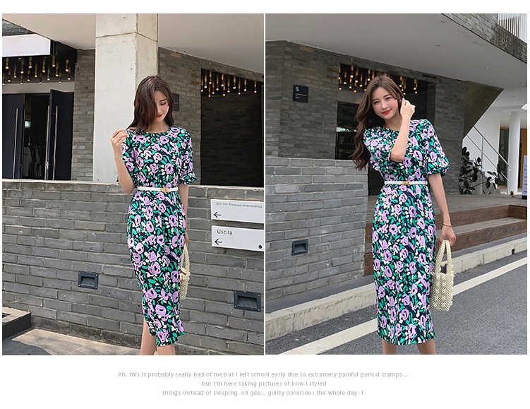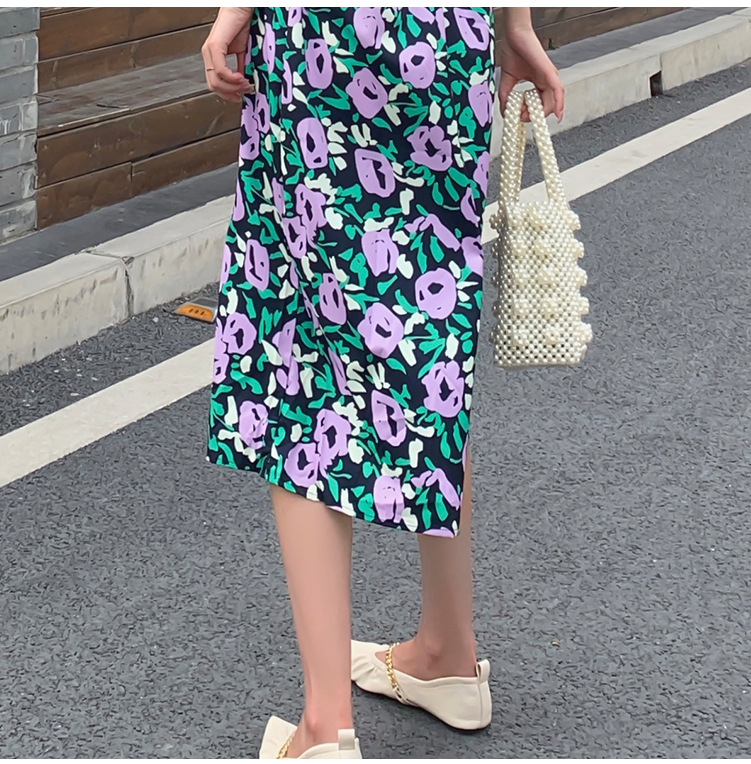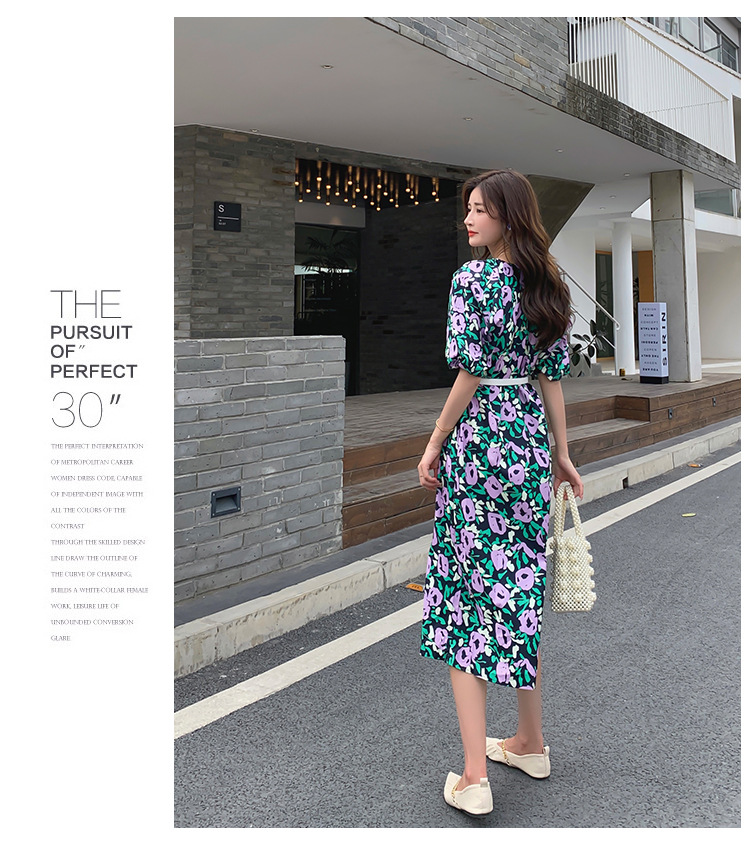 한 펑 섹시한 꽃 원피스 여자의 봄과 여름 허리 슬리밍 우아한 후면 분할 중간 길이 원피스스토어 가기