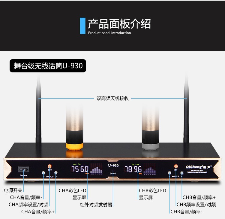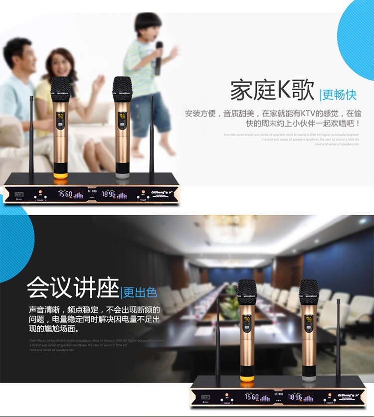 Qi Sheng QM-930 무선 마이크 1 대 2 U 세그먼트 무선 마이크 가족 ktv 웨딩 무대 공연 회의