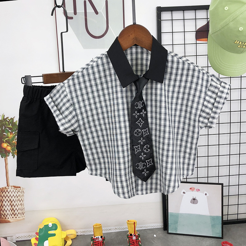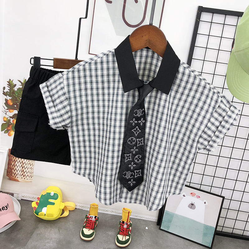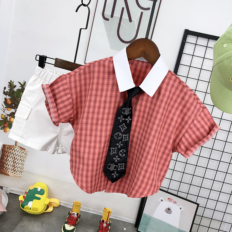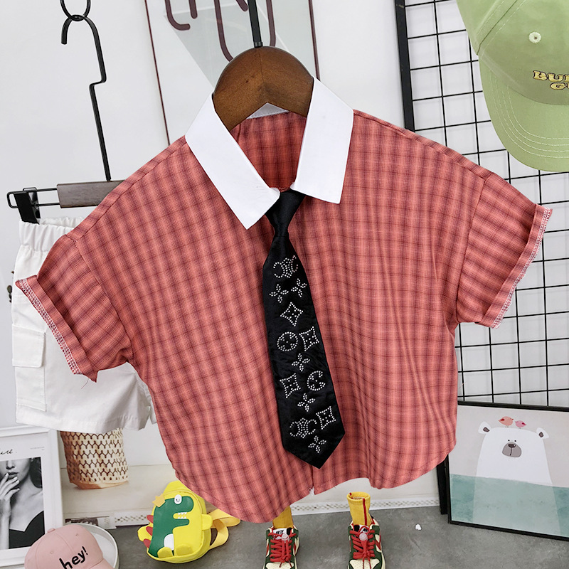 남아 타이 셔츠 아동 반팔 셔츠 캐주얼 한국식 루즈한 아동 체크 무늬 탑 가디건