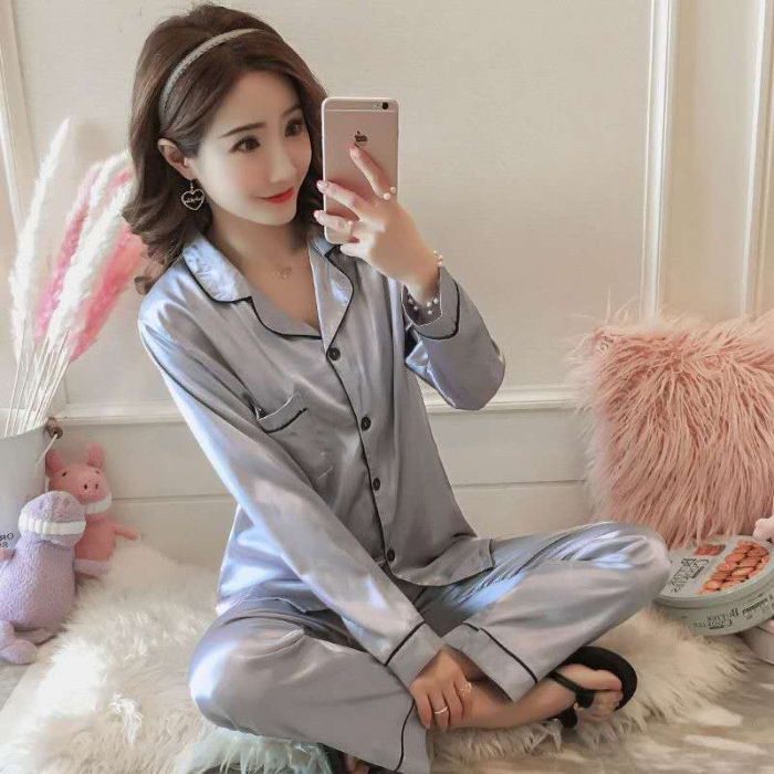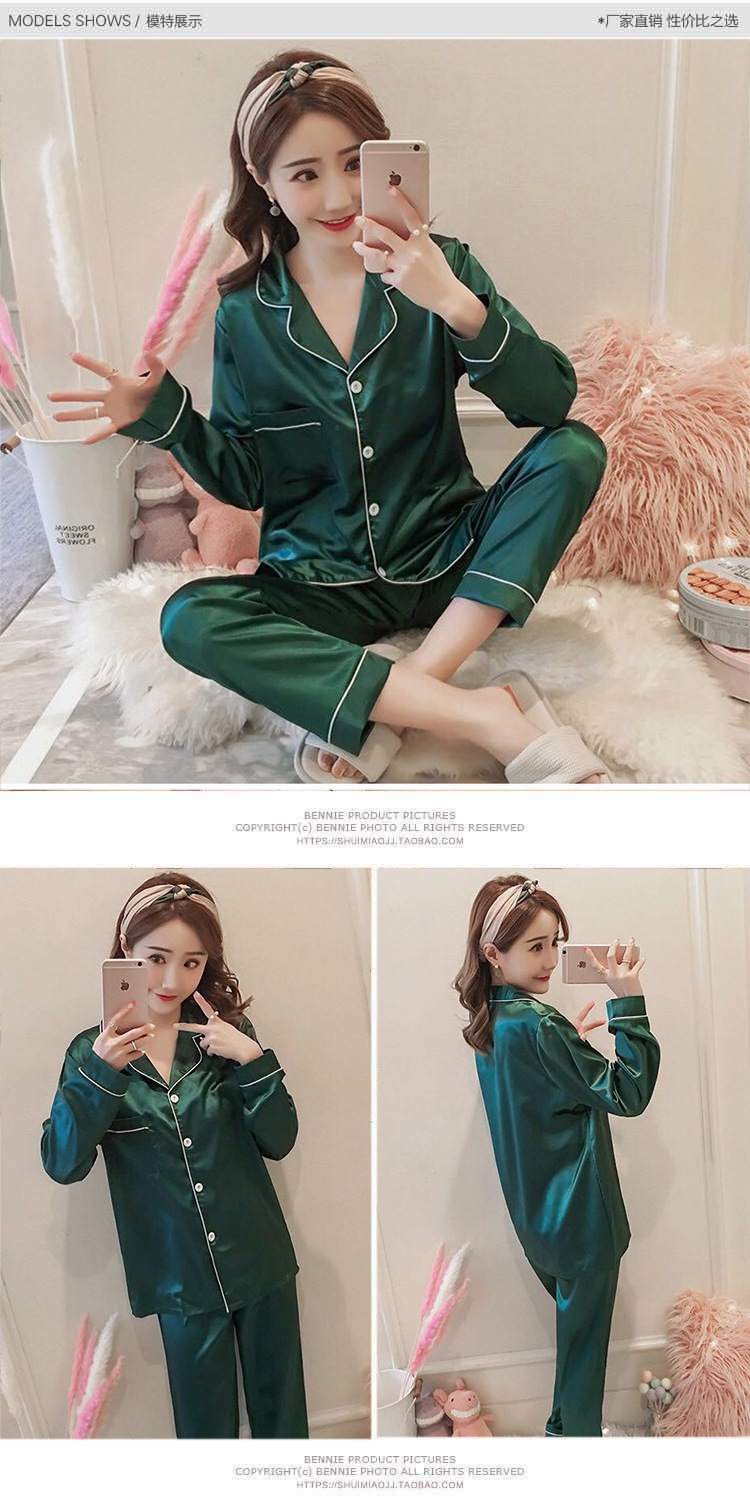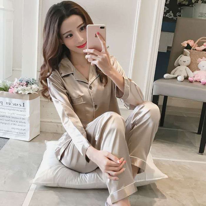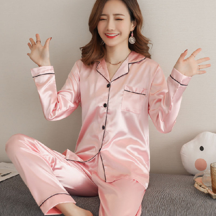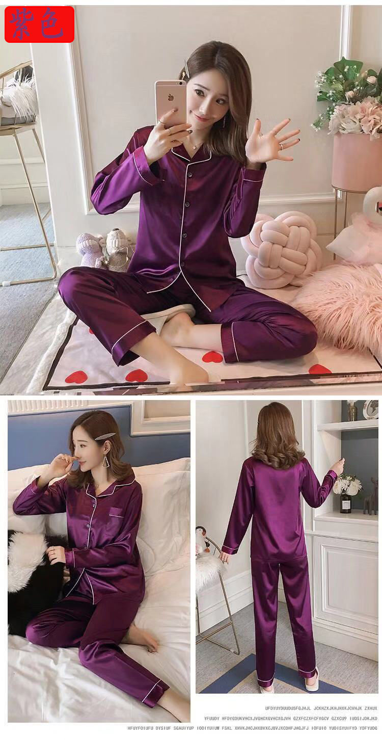 마이크로 비즈니스 봄과 가을 여름 단색 잠옷 여자 아이스 실크 긴 소매 바지 2 종 세트 실크 가정 옷 잠옷 도매스토어 가기