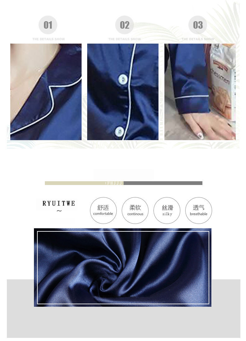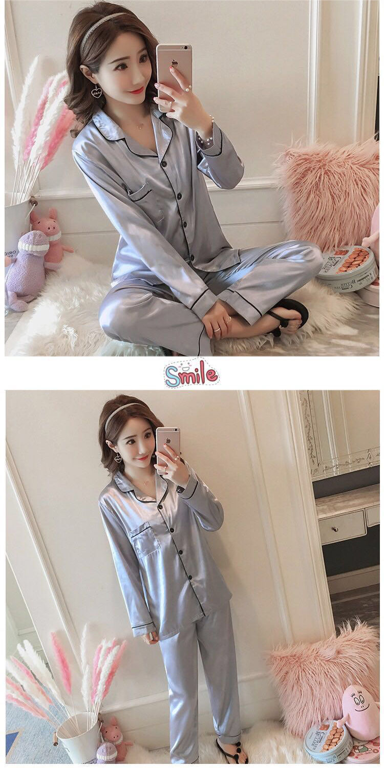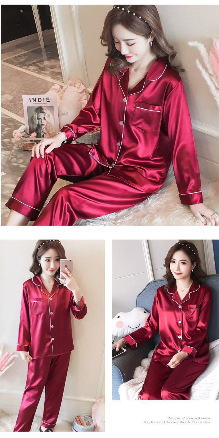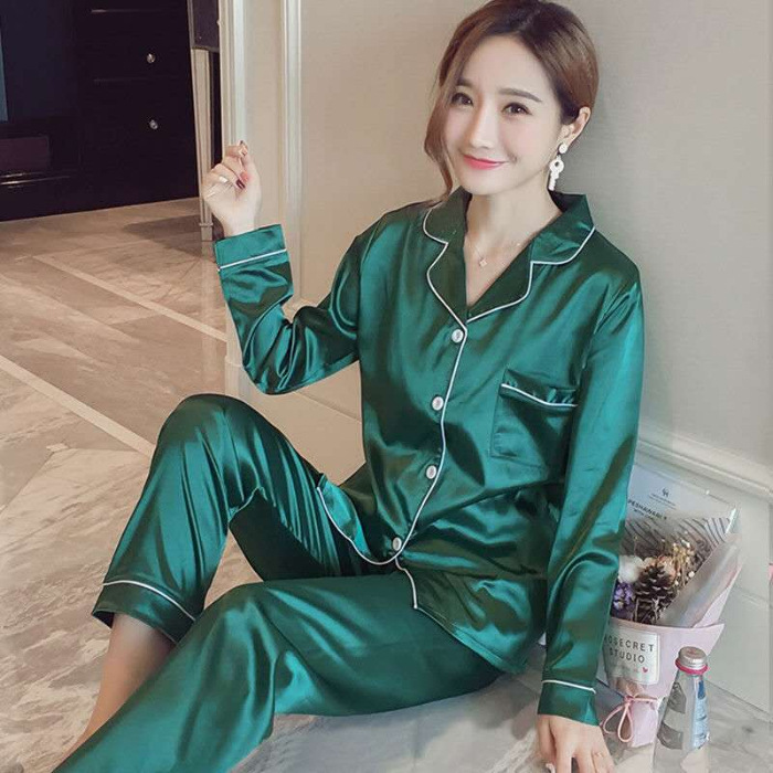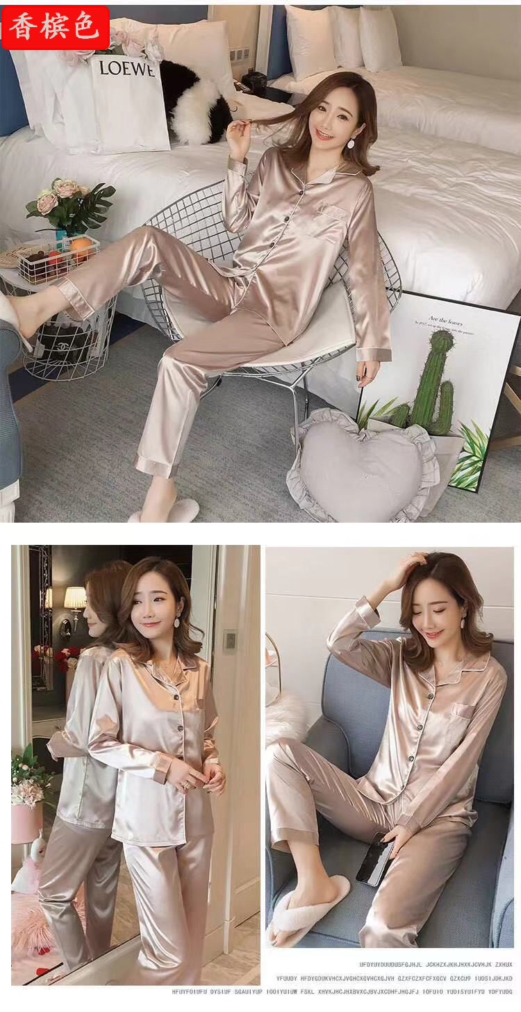 마이크로 비즈니스 봄과 가을 여름 단색 잠옷 여자 아이스 실크 긴 소매 바지 2 종 세트 실크 가정 옷 잠옷 도매스토어 가기