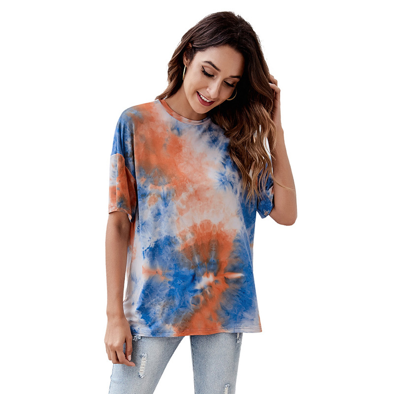 패션 풀오버 여성용 청소년 탑 타이 염색 밀크 실크 티셔츠 라운드 넥 풀오버 반팔 캐주얼 루즈한 티셔츠스토어 가기