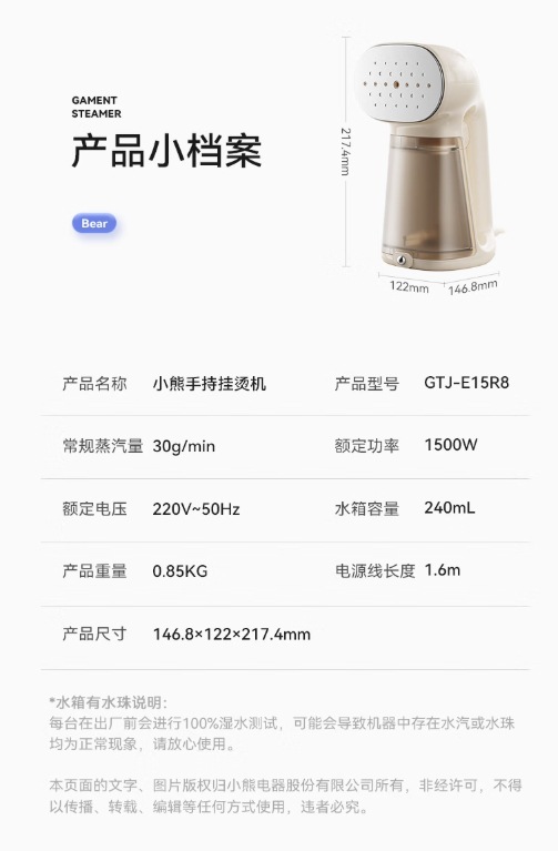 베어 휴대용 의류 스팀 다리미 가정용 스팀 다리미 휴대용 기숙사용 다림질 기계 GTJ-E15R8