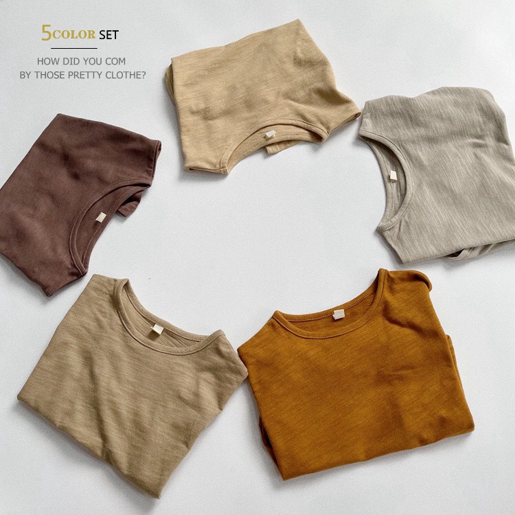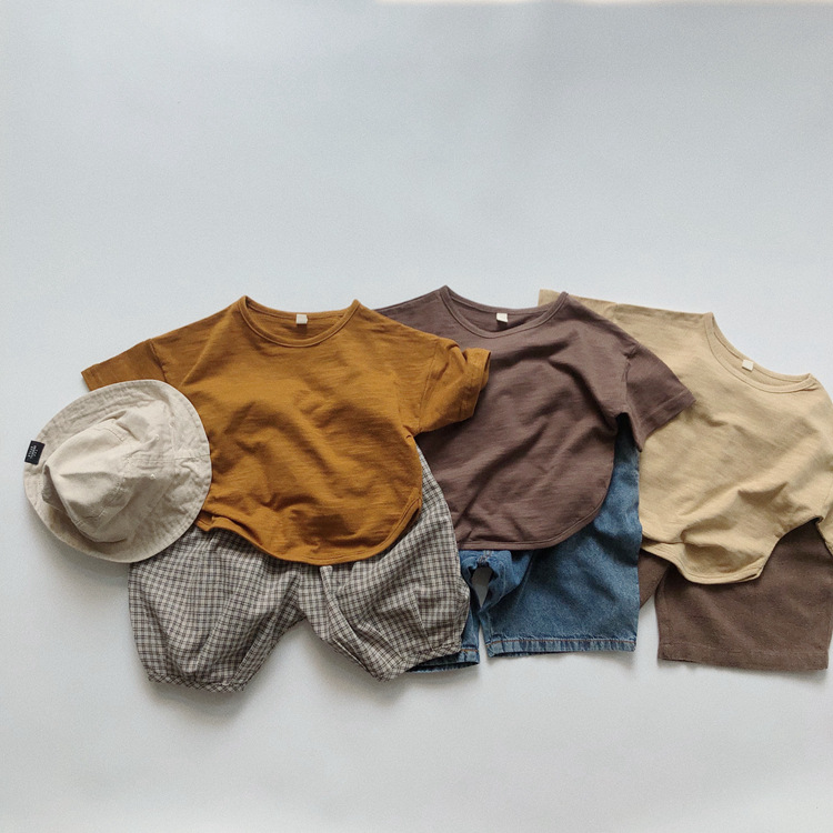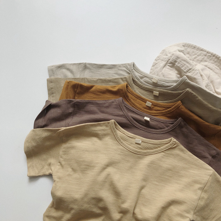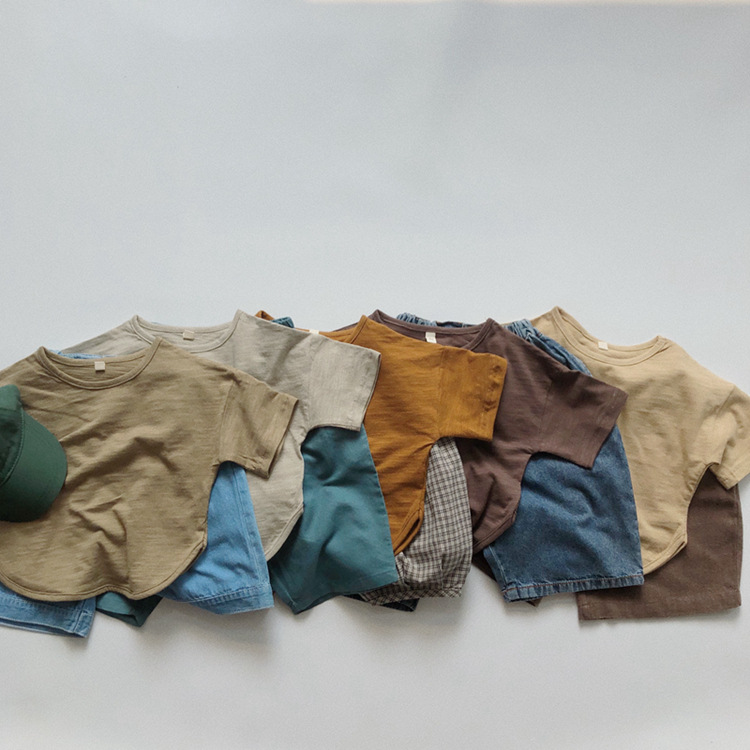 어린이 반팔 티셔츠 여름 새로운 한국 스타일 레트로 슬러브 코튼 퓨어 모리 스타일 소년과 소녀를위한 라운드 넥 탑스토어 가기