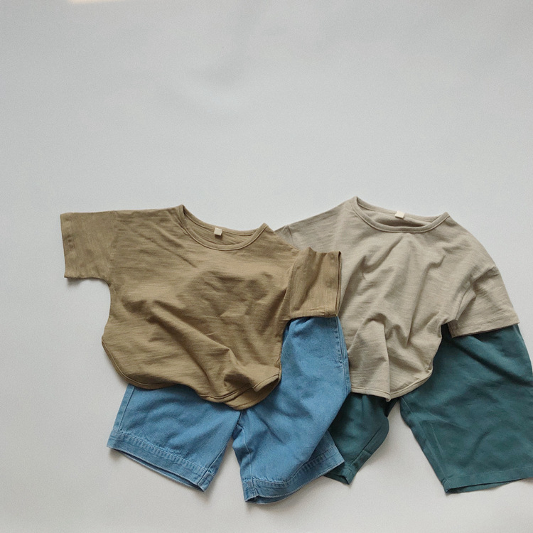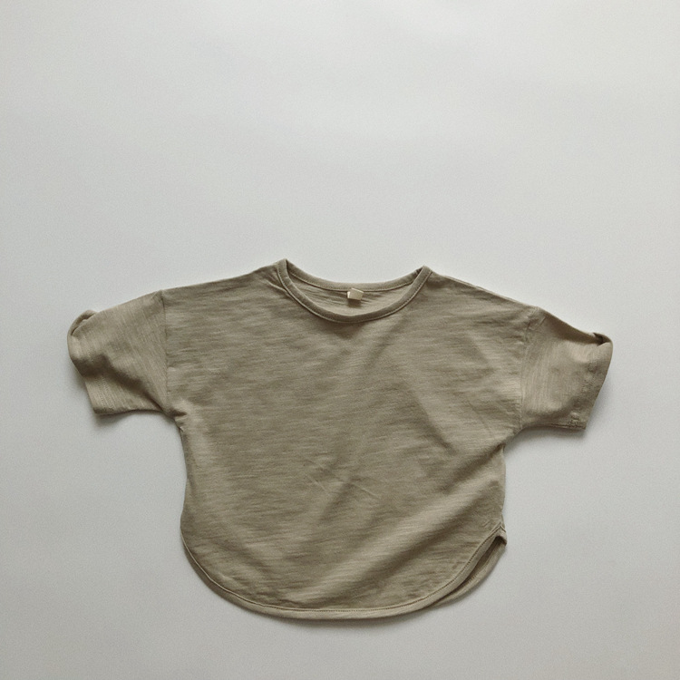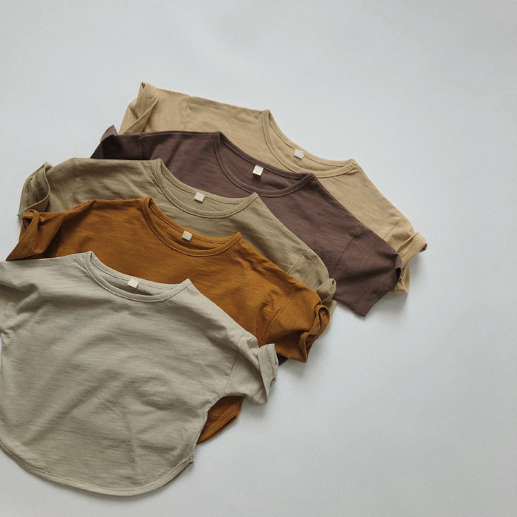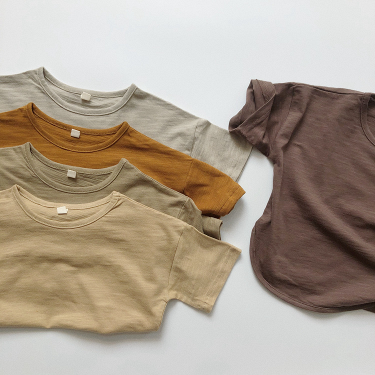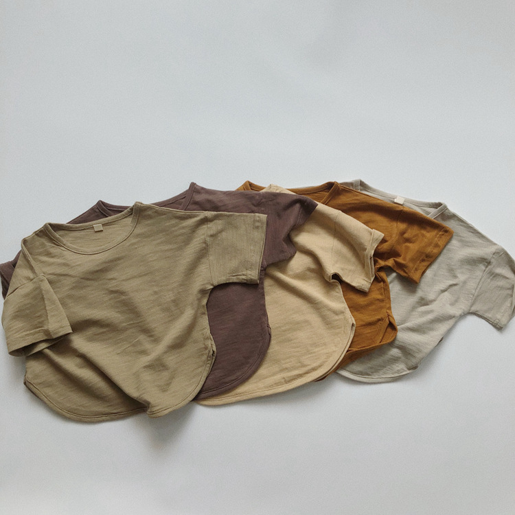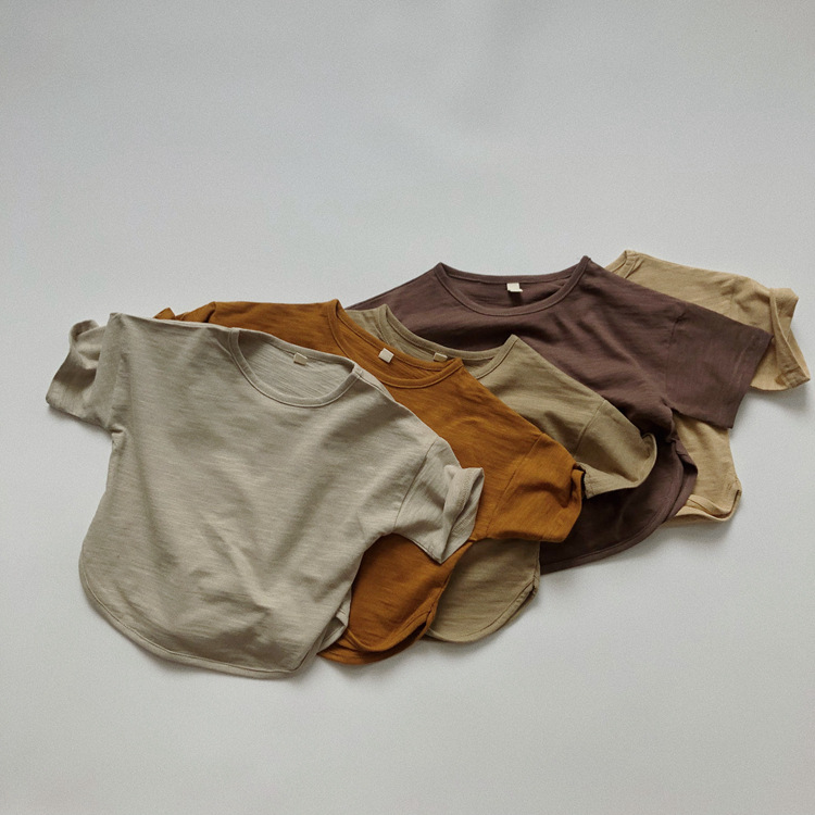 어린이 반팔 티셔츠 여름 새로운 한국 스타일 레트로 슬러브 코튼 퓨어 모리 스타일 소년과 소녀를위한 라운드 넥 탑