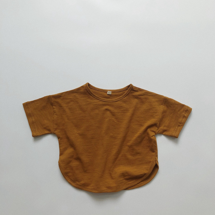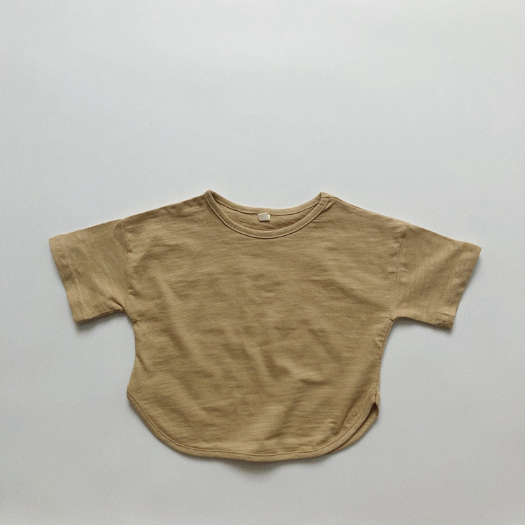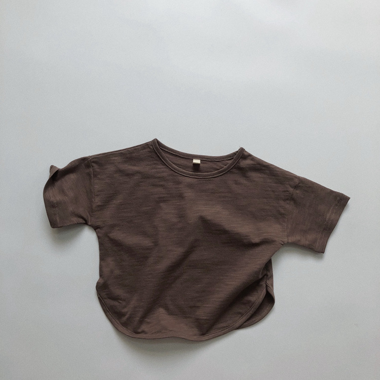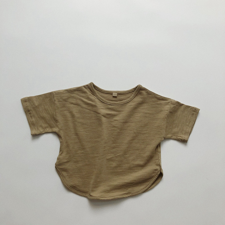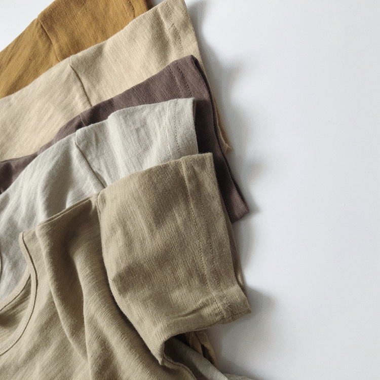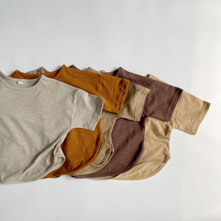 어린이 반팔 티셔츠 여름 새로운 한국 스타일 레트로 슬러브 코튼 퓨어 모리 스타일 소년과 소녀를위한 라운드 넥 탑