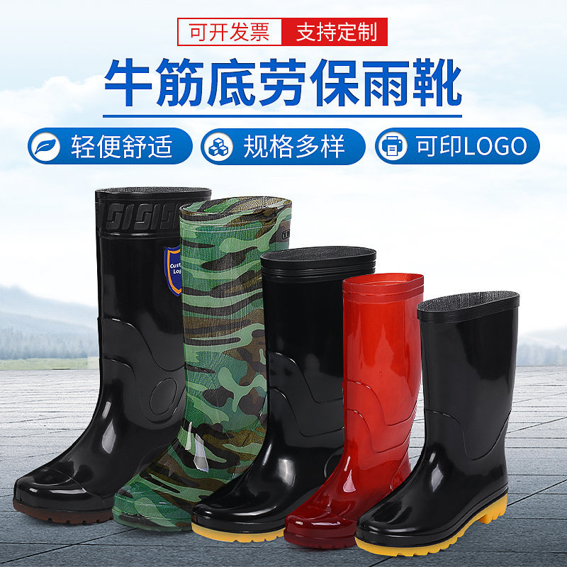 • 现货男士厂家批发时尚长筒高帮钓鱼厨房工地靴黑色高筒劳保雨鞋