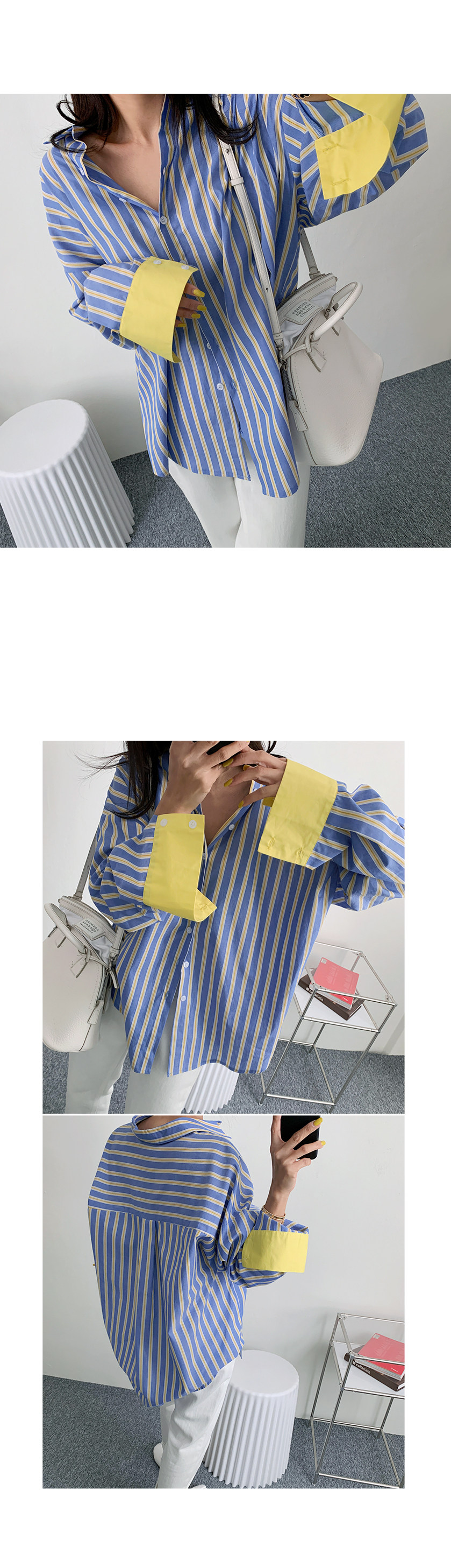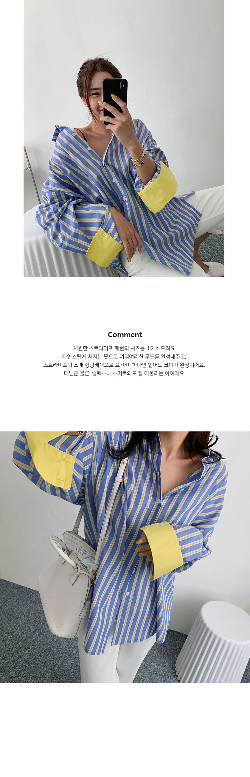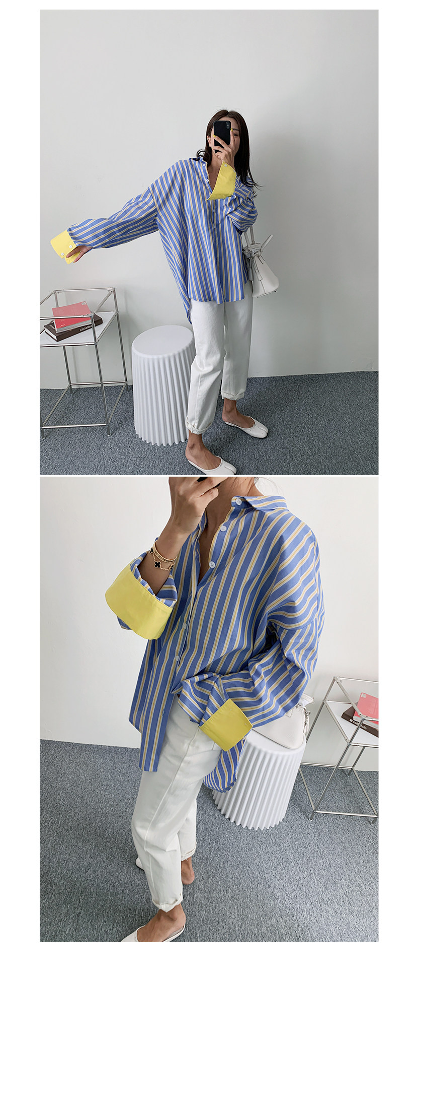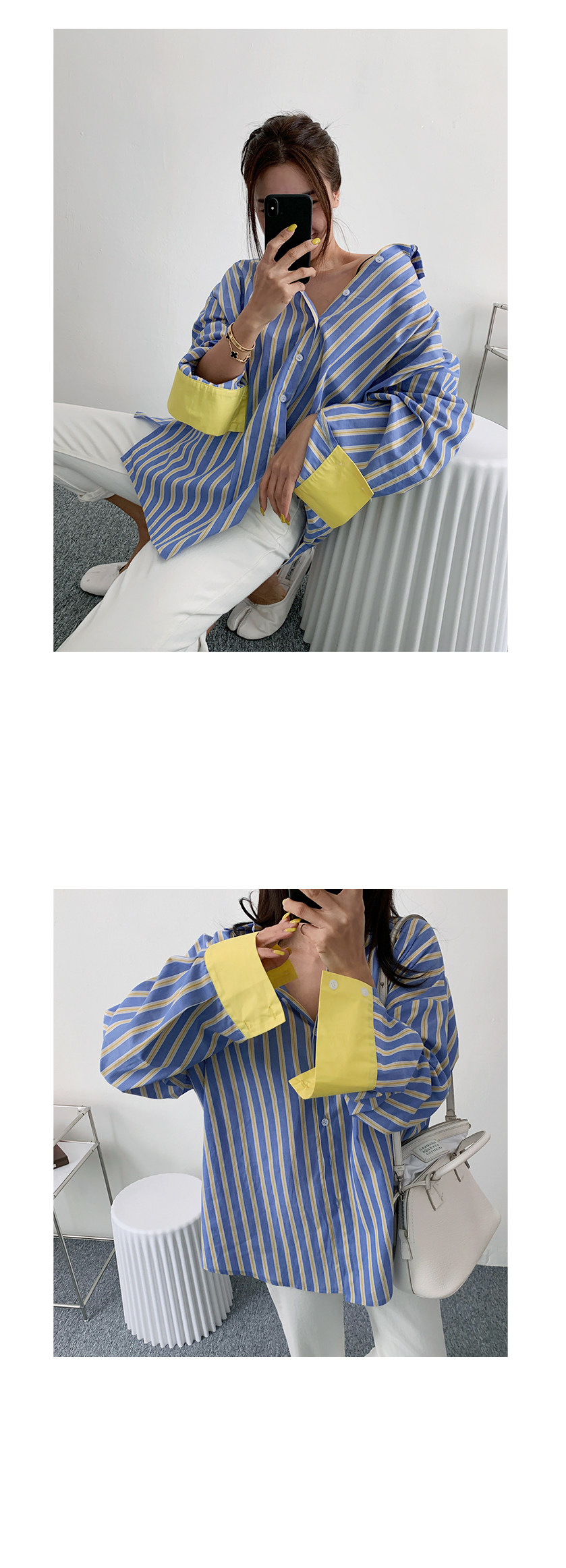 봄과 가을 새로운 대비 컬러 스트라이프 셔츠 여성의 한국 스타일 느슨한 슬리밍 중간 길이 베이스 셔츠 유행 캐주얼 탑스토어 가기