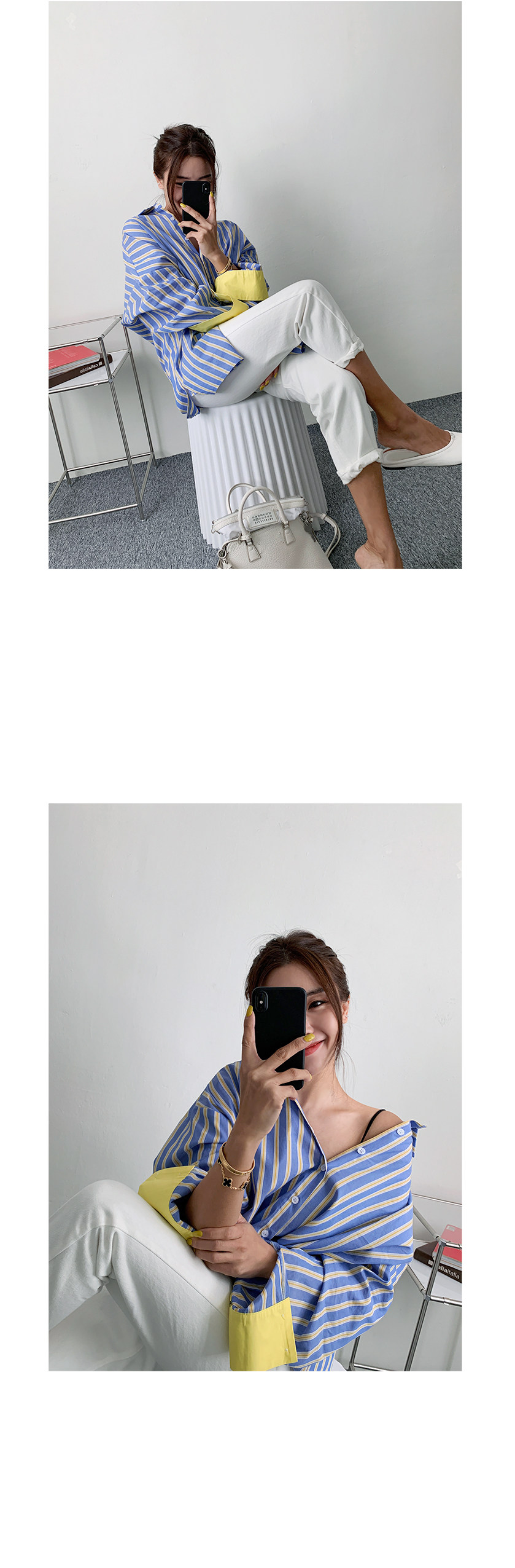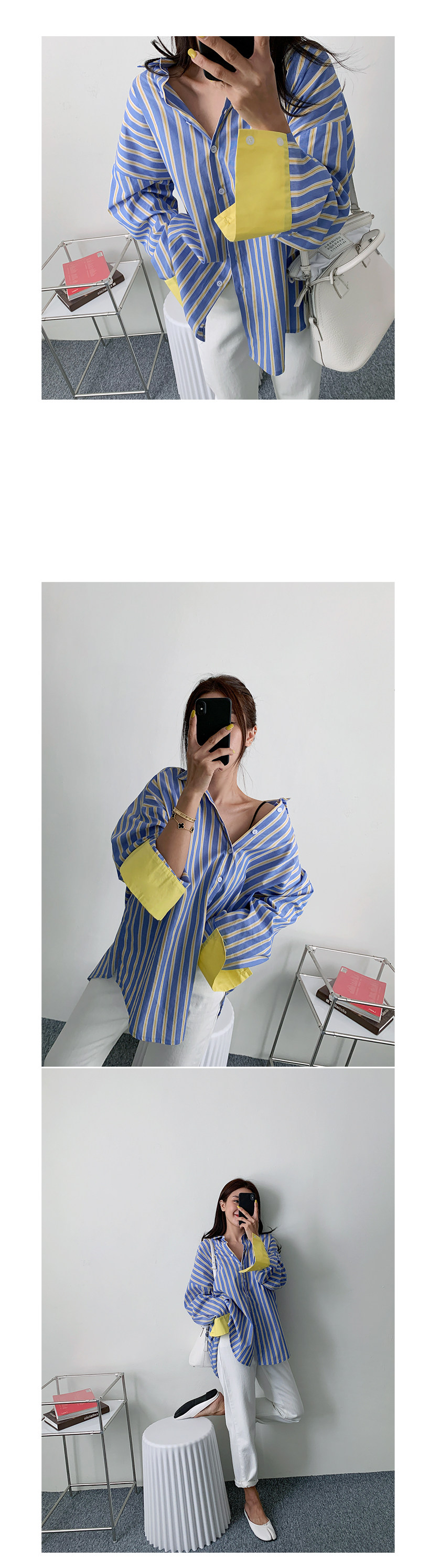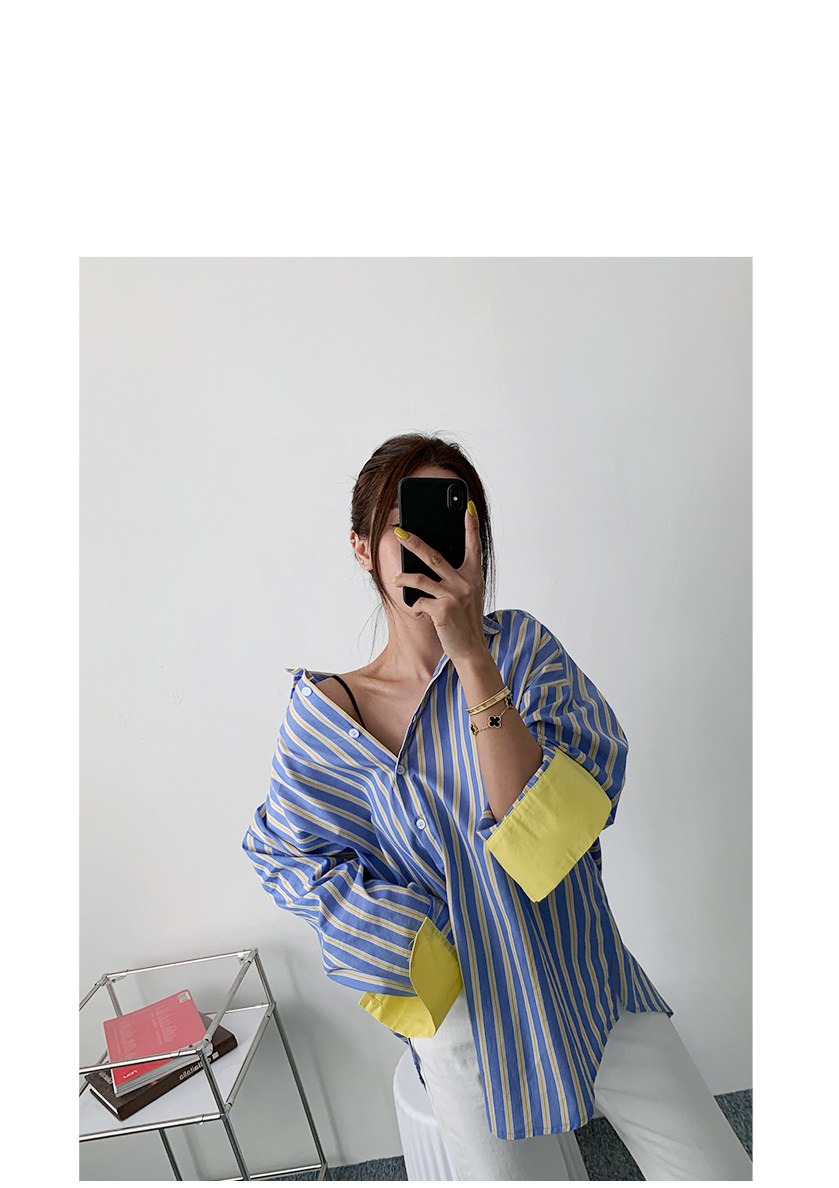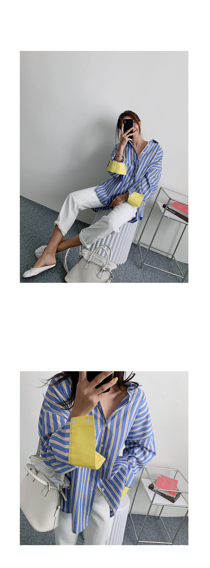 봄과 가을 새로운 대비 컬러 스트라이프 셔츠 여성의 한국 스타일 느슨한 슬리밍 중간 길이 베이스 셔츠 유행 캐주얼 탑