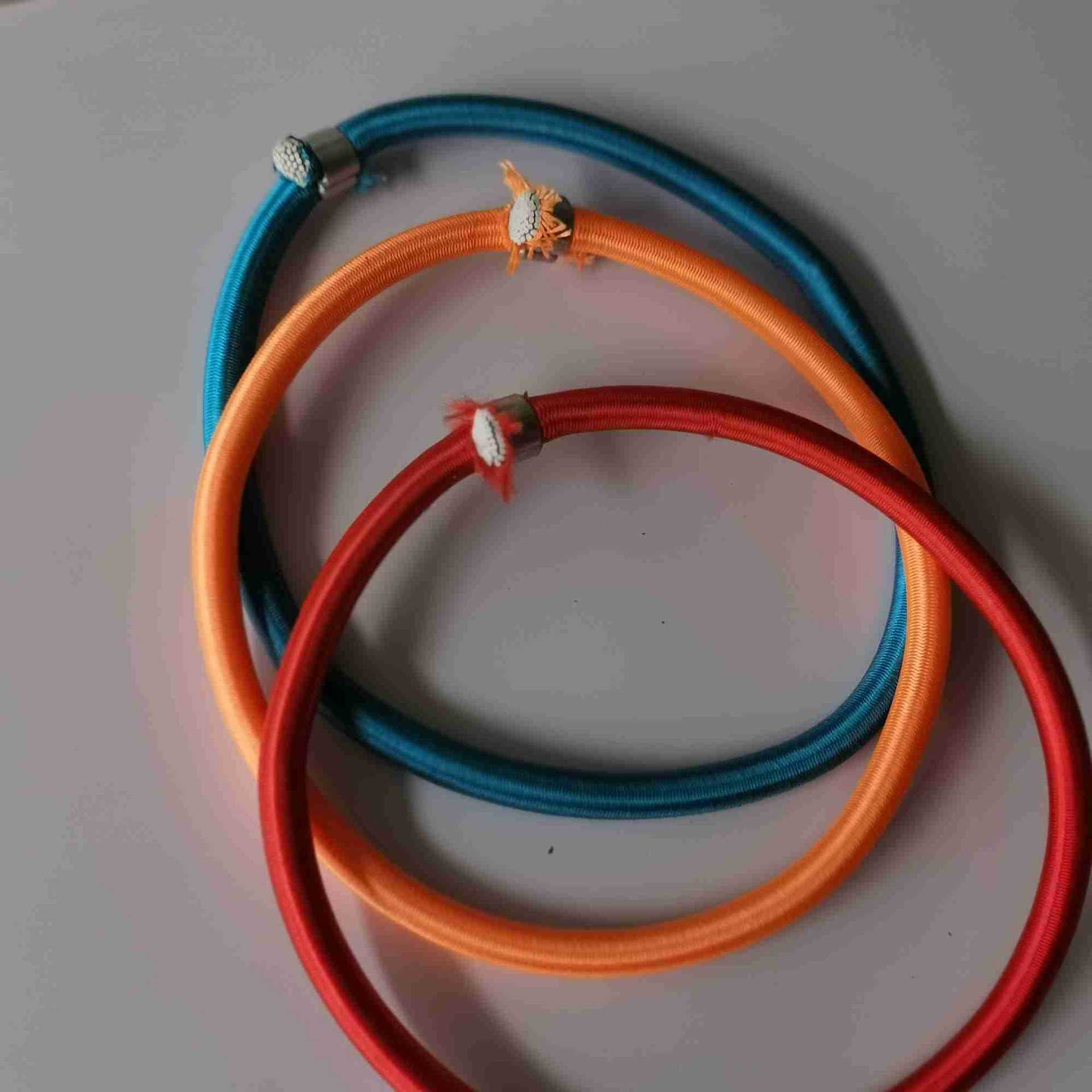 弹力绳采用尼龙加乳胶丝经高速编织机编织而成,按客户要求规格尺寸用铝扣压头,然后放入球珠成型