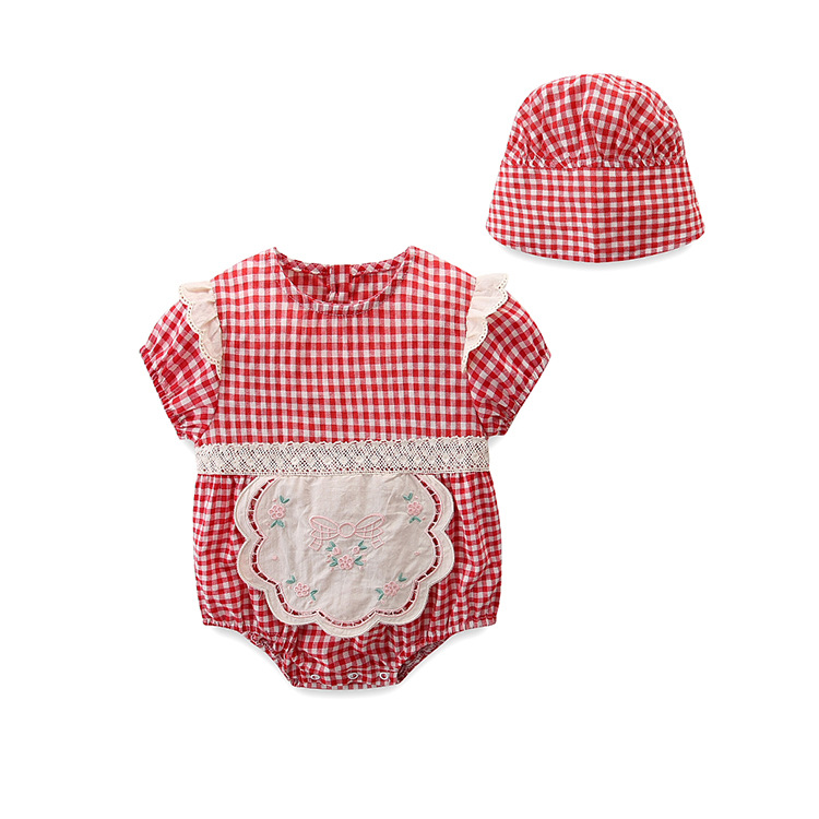 2023 여름 새로운 격자 무늬 후드 삼각형 등반 세트 신생아 아기 소녀 붐 방귀 세트 멋진 점프 슈트 유행 2227