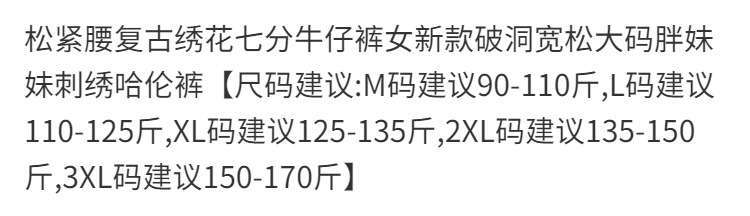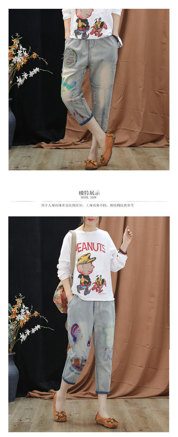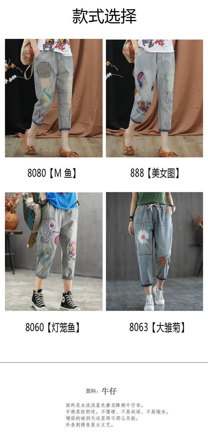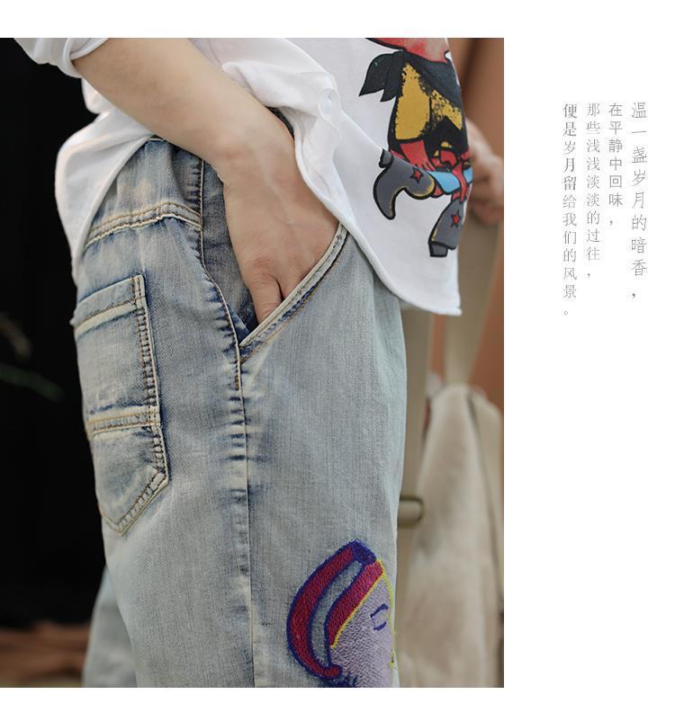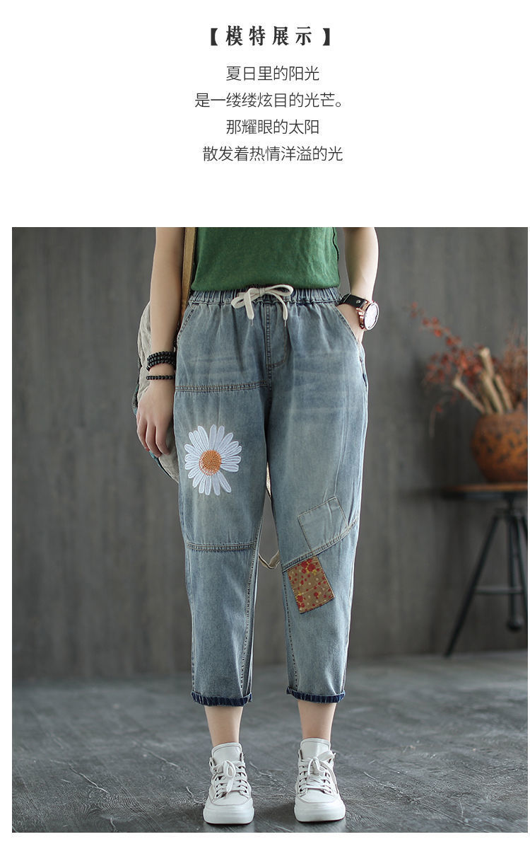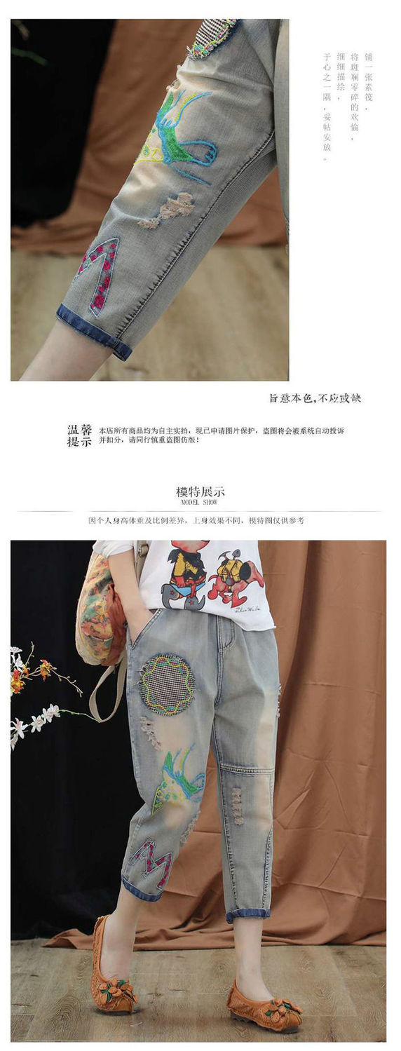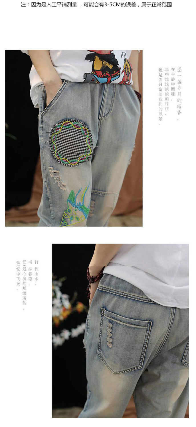 탄성 허리 빈티지 자수 크롭 청바지 여자의 봄과 여름 새로운 찢어진 느슨한 플러스 사이즈 자수 모든 일치 하렘 바지스토어 가기