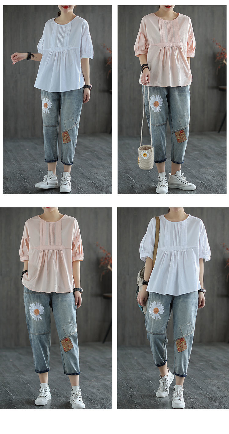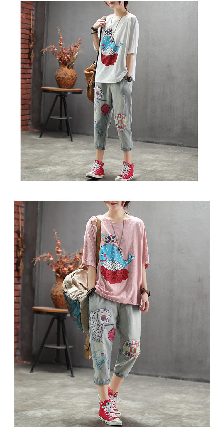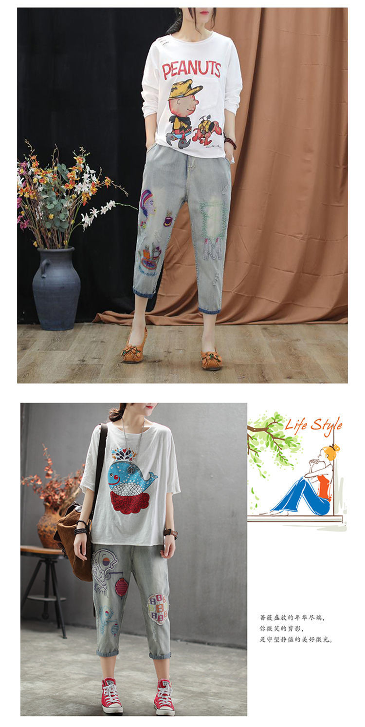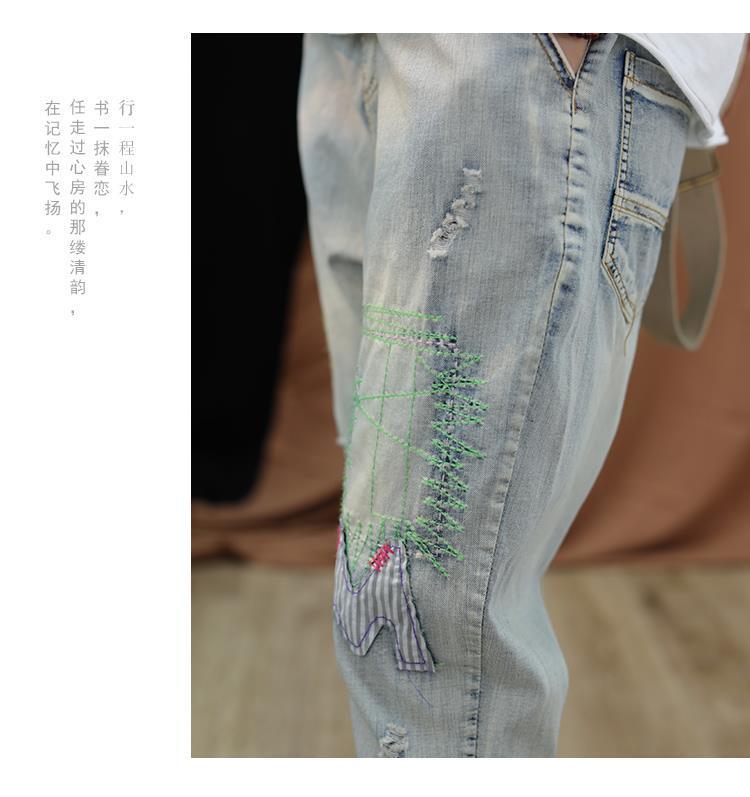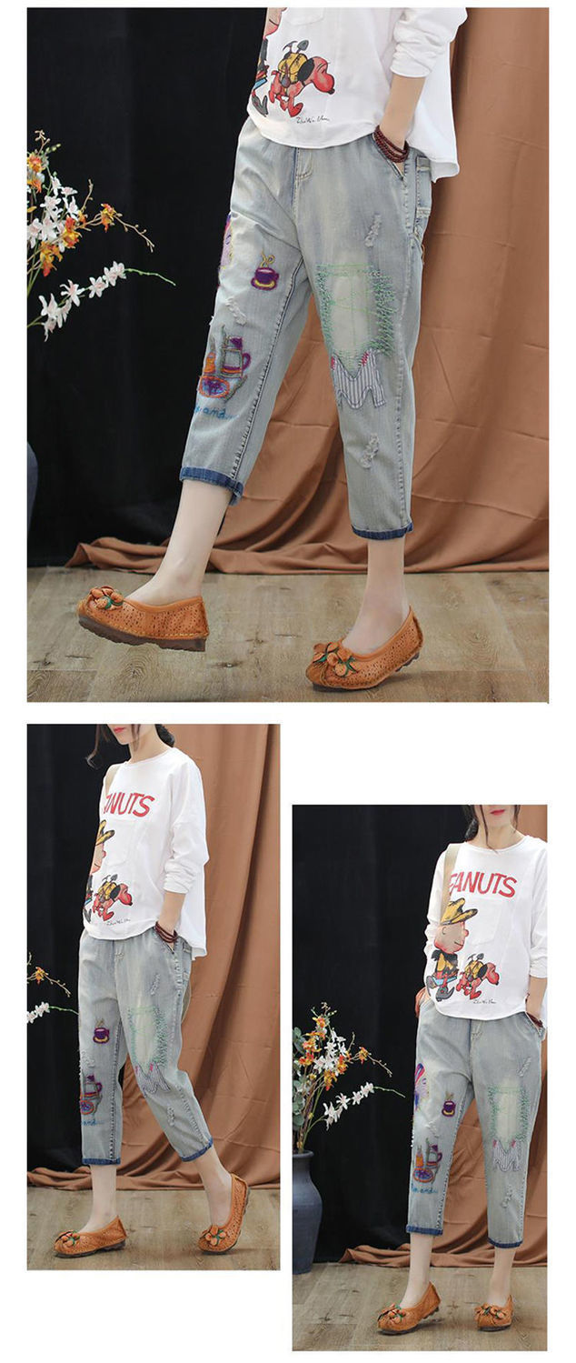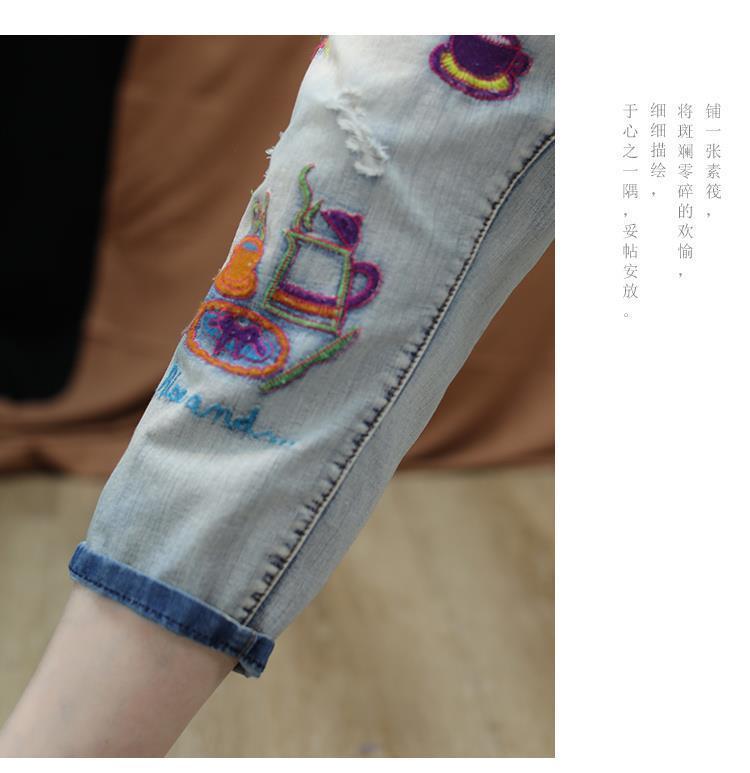 탄성 허리 빈티지 자수 크롭 청바지 여자의 봄과 여름 새로운 찢어진 느슨한 플러스 사이즈 자수 모든 일치 하렘 바지스토어 가기
