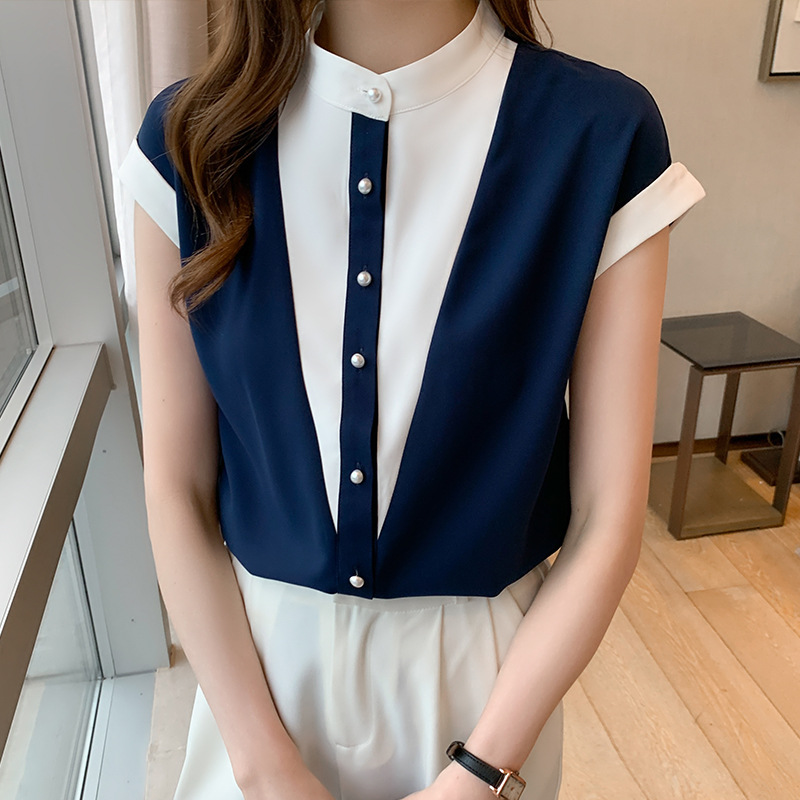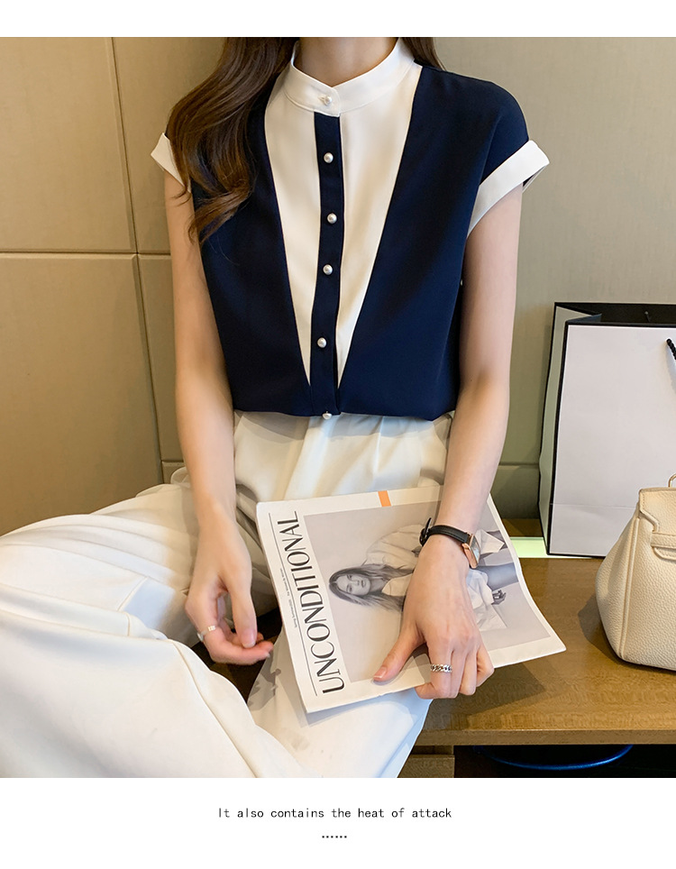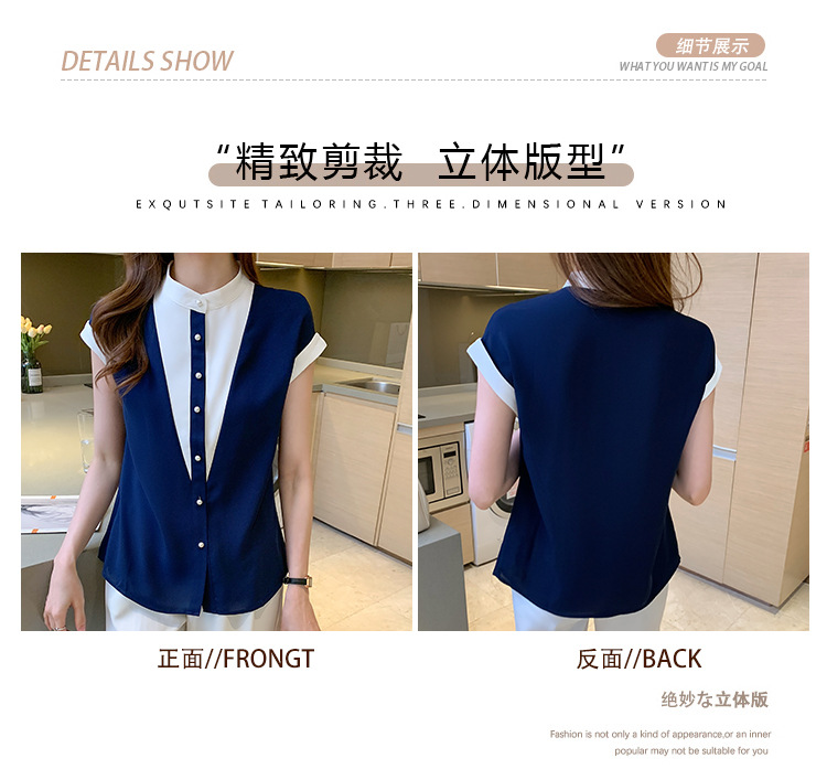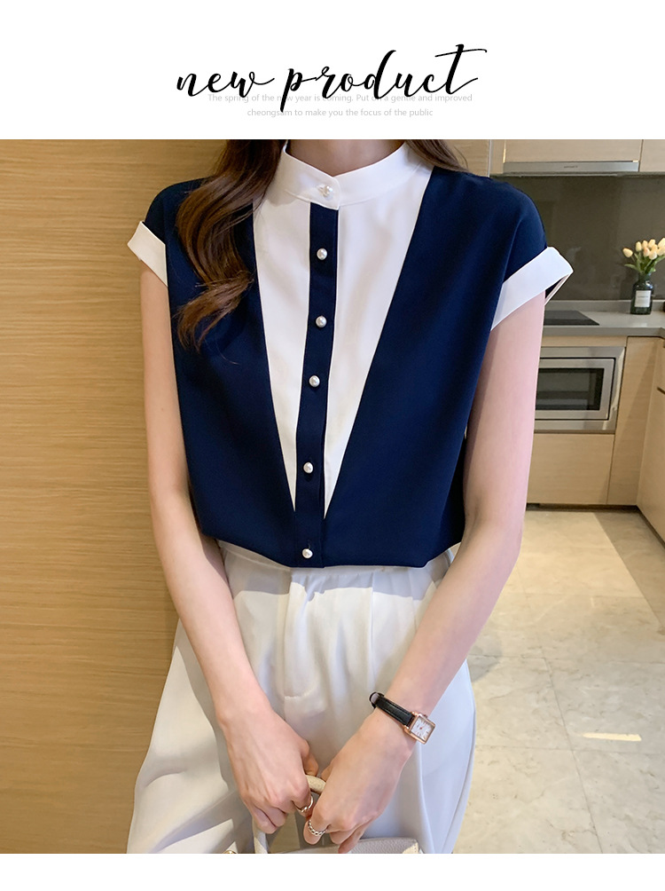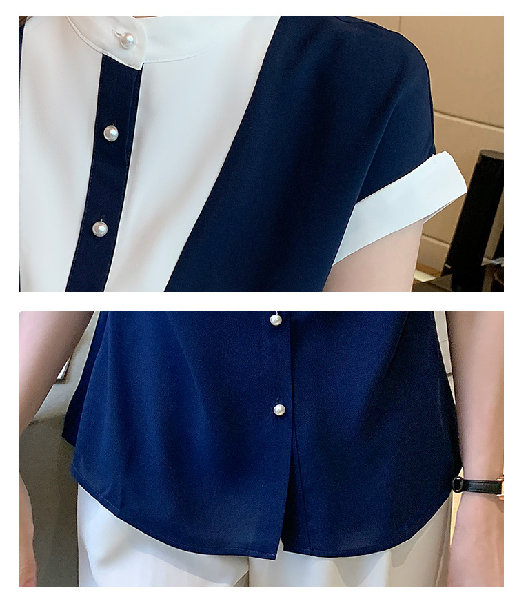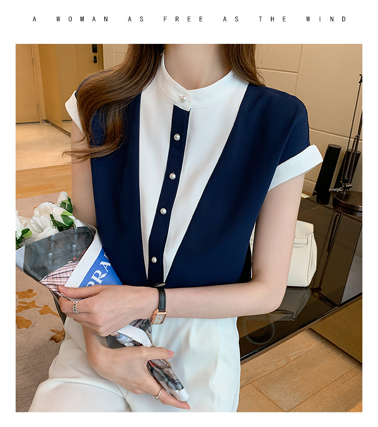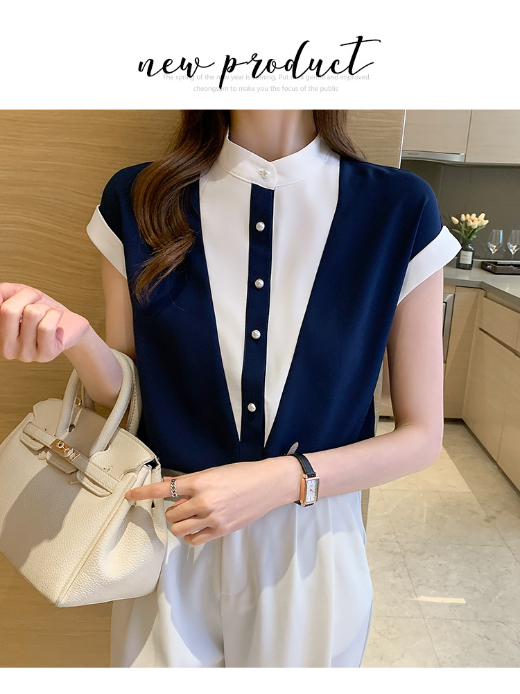 시폰 셔츠 여성 디자인 국경 2025 여름 새로운 기질 대비 색상 작은 스탠드 칼라 접합 반팔 셔츠 유행스토어 가기