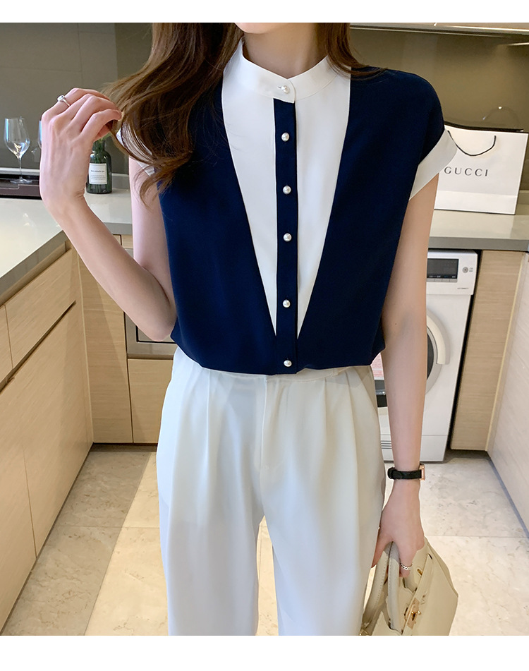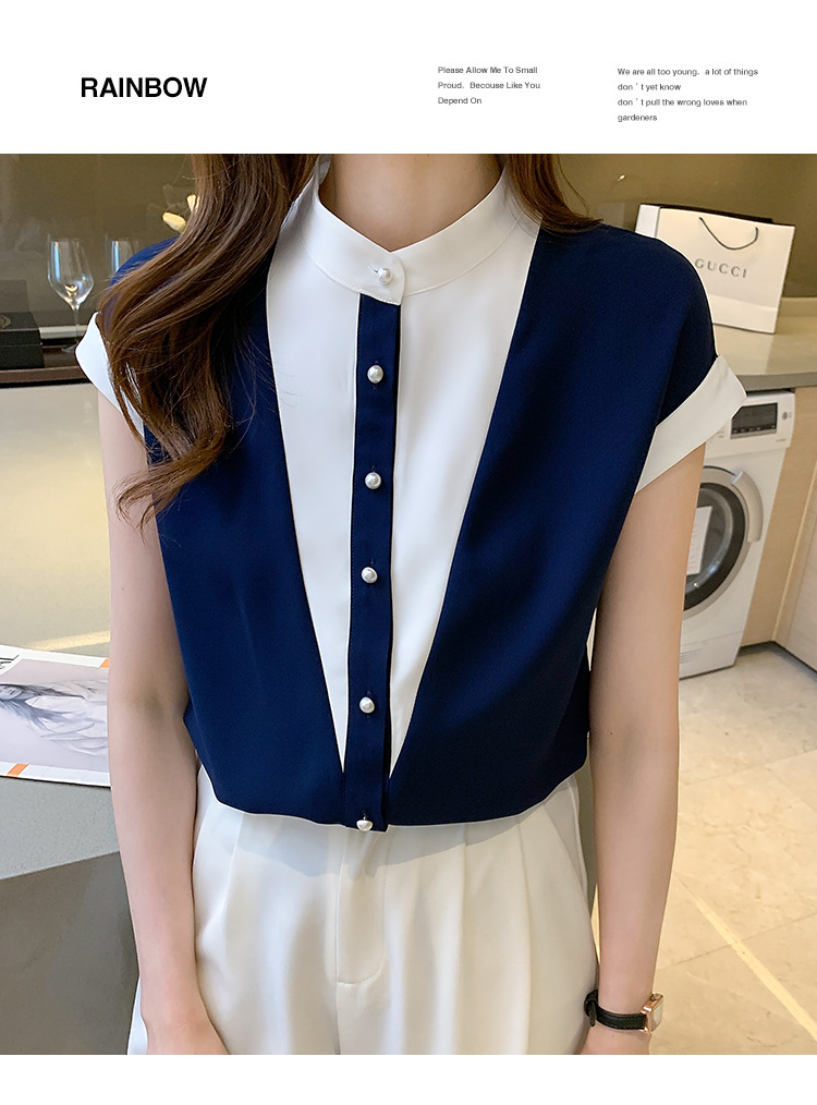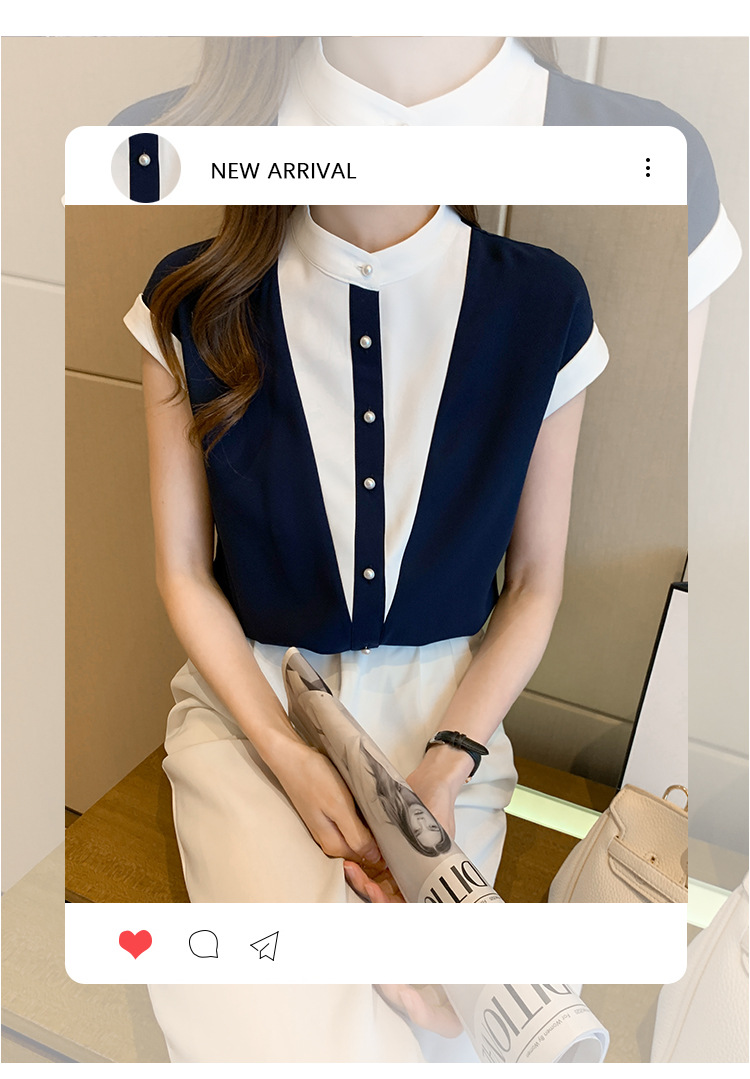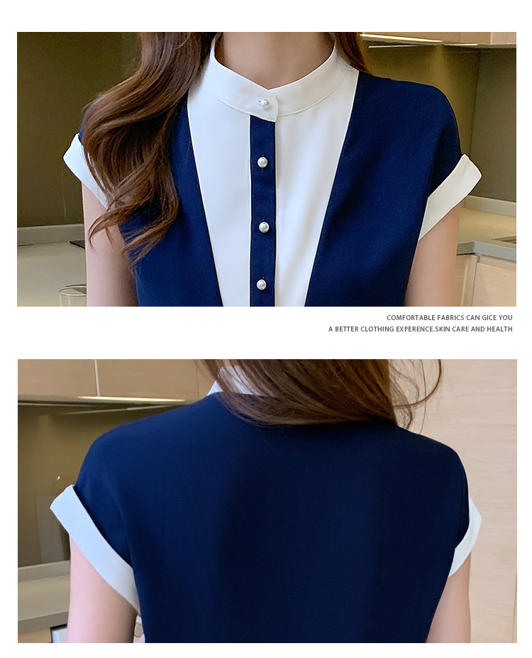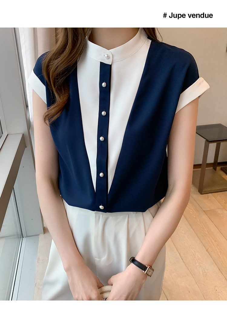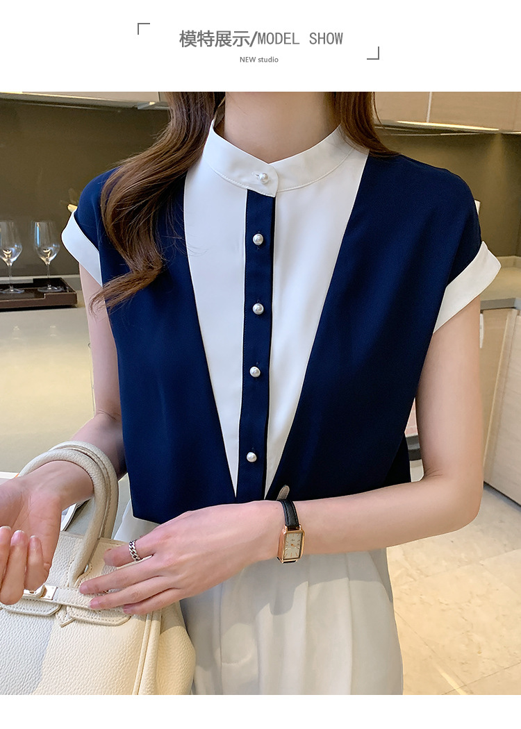 시폰 셔츠 여성 디자인 국경 2025 여름 새로운 기질 대비 색상 작은 스탠드 칼라 접합 반팔 셔츠 유행스토어 가기