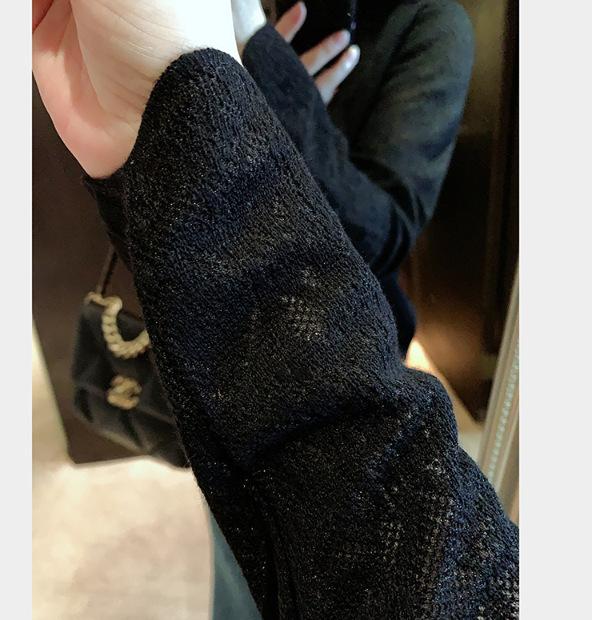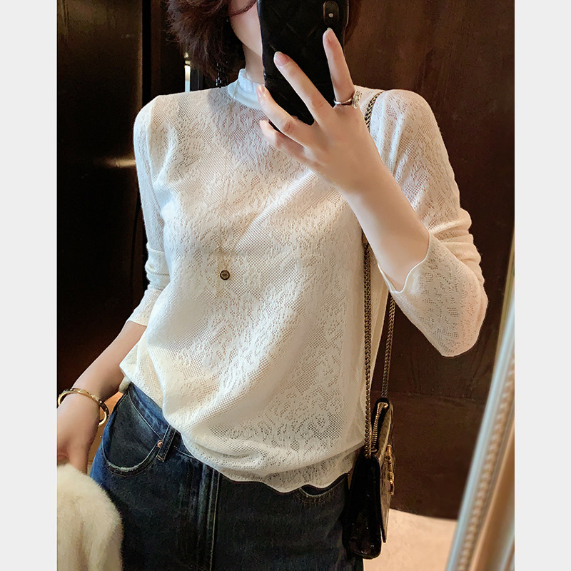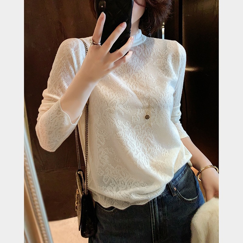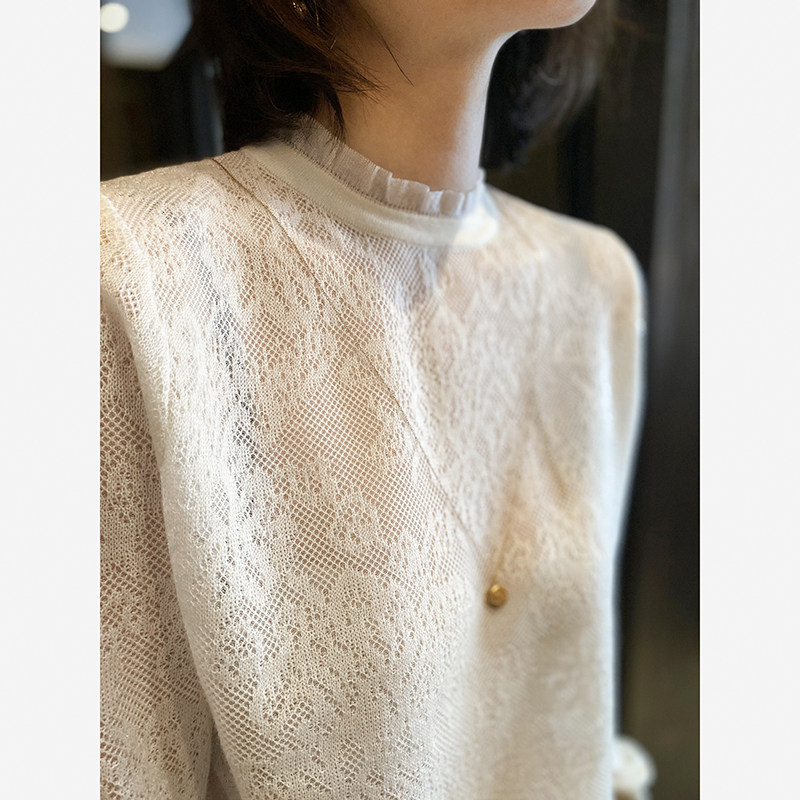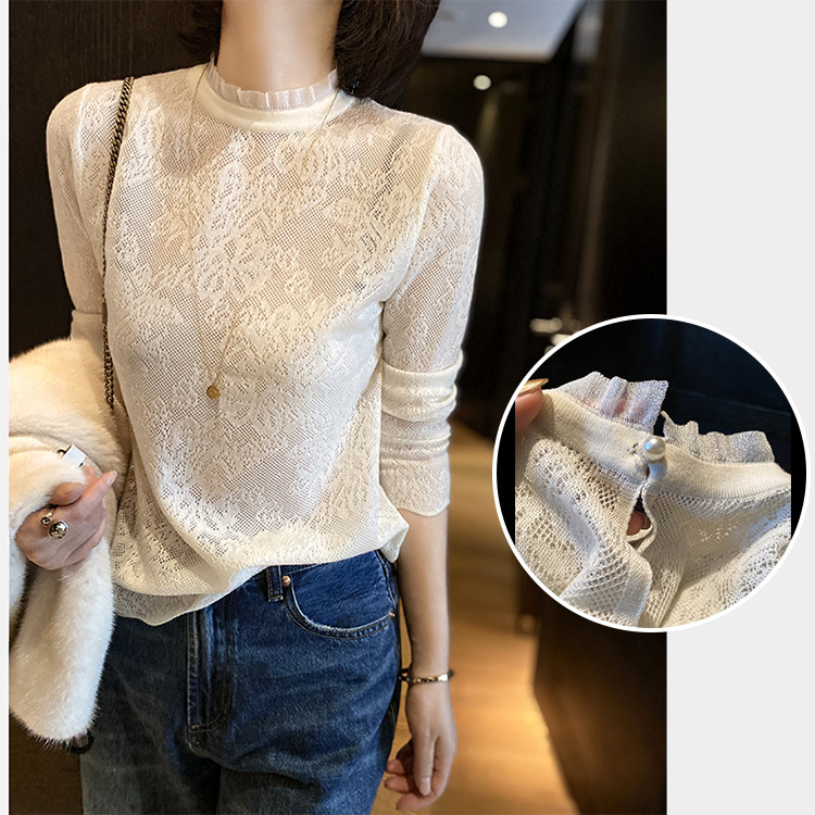 유럽 역 우아한 프랑스 크로 셰 뜨개질 중공 메쉬 귀 가장자리 작은 스탠드 칼라베이스 스웨터 여성 탑스토어 가기