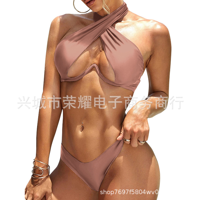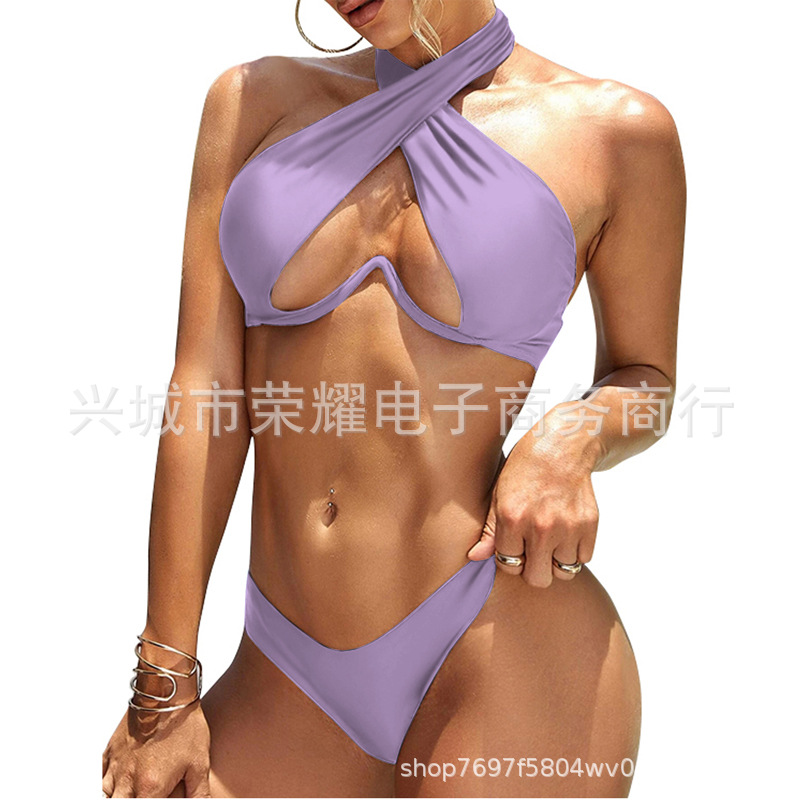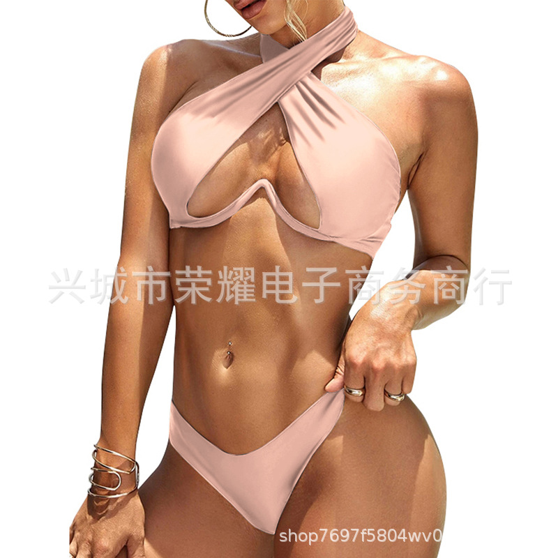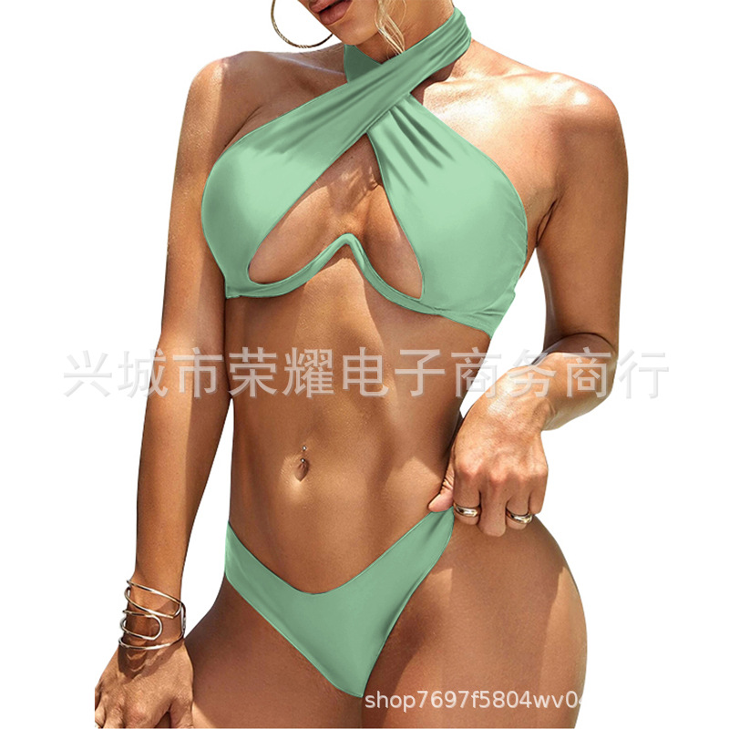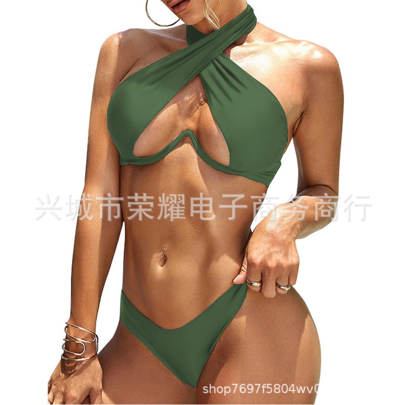 유럽과 미국의 새로운 대외 무역 아마존 수영복 여성 솔리드 컬러 스트랩 크로스 스플릿 수영복 비키니 bikin2024