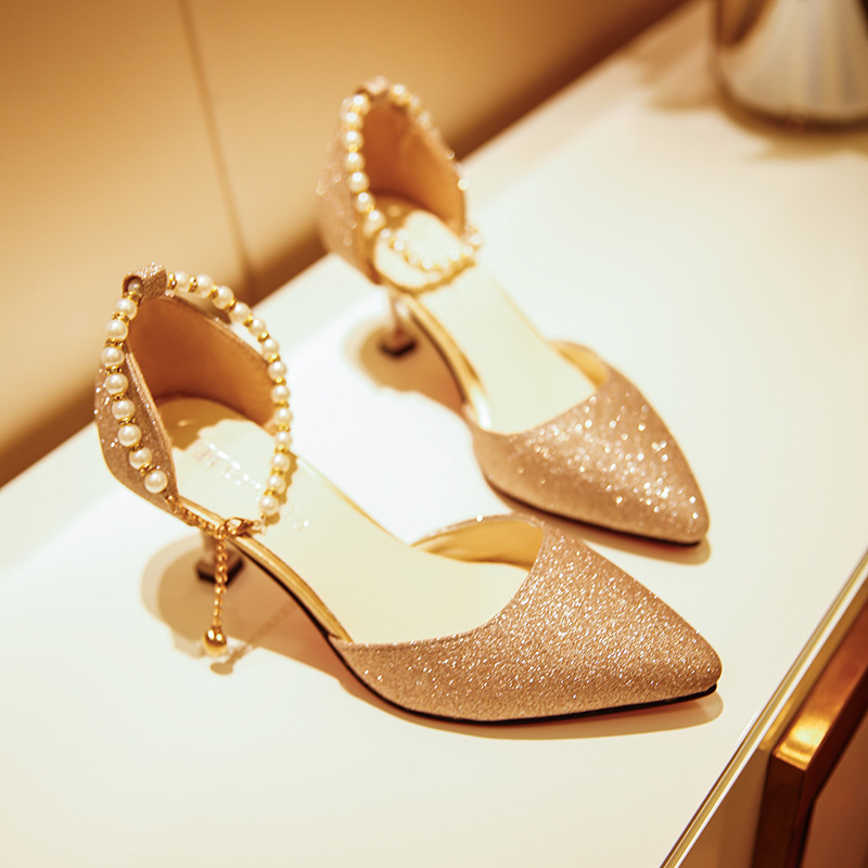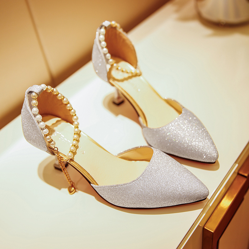 새로운 와인 컵 힐과 싱글 슈즈 2025 여름 비즈 여성 샌들 원 버클 중공 하이힐 뾰족한 신부 들러리 신발스토어 가기