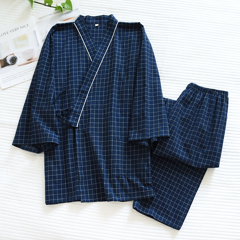 • 남성용 블루-원 라인 워시 코튼 기모노 세트