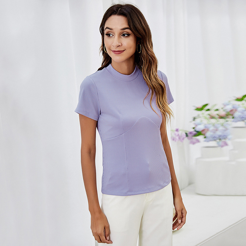 여름 새로운 패션 풀오버 여성용 단색 핏 티셔츠 라운드 넥 반팔 어반 캐주얼 슬림 티셔츠