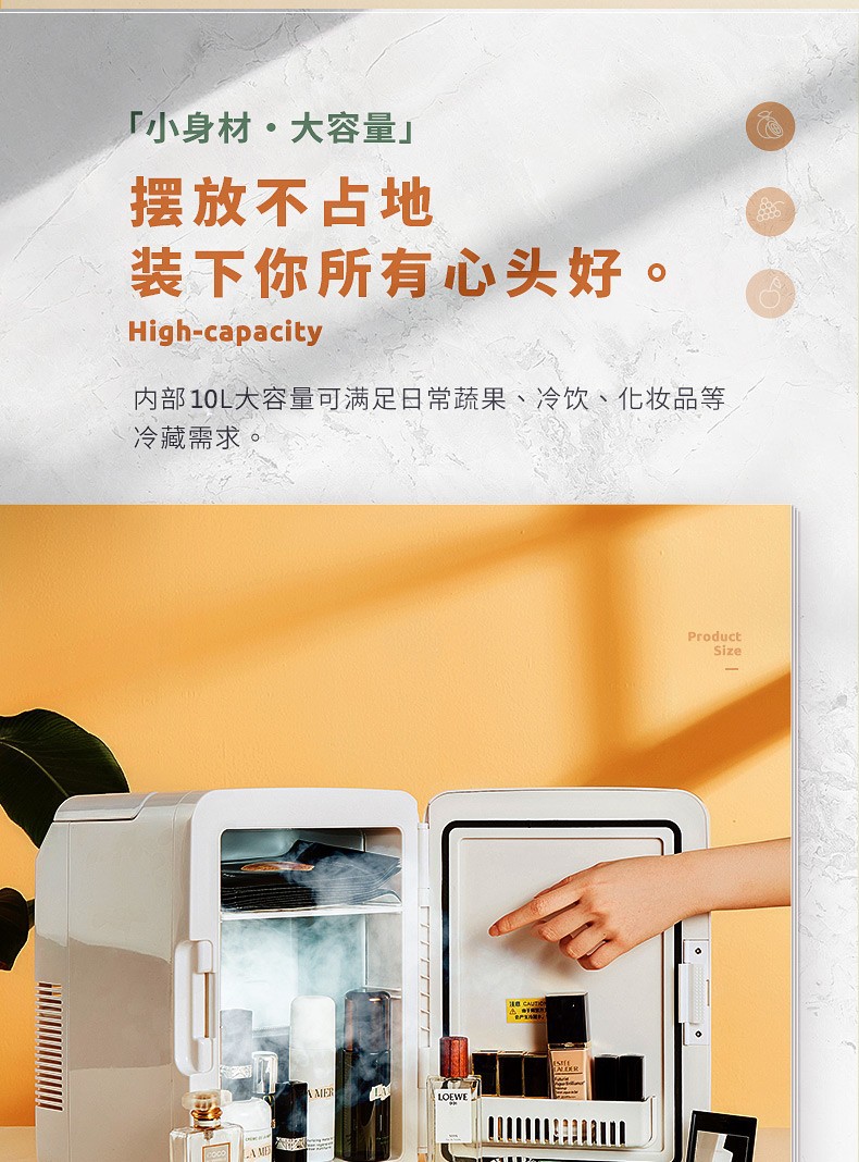 【车载冰箱适用范围】:半导体制冷款:适用于饮料、食物、水果、化妆品、牛奶的保鲜储存及保温。单核不能放肉类,不能冷冻。