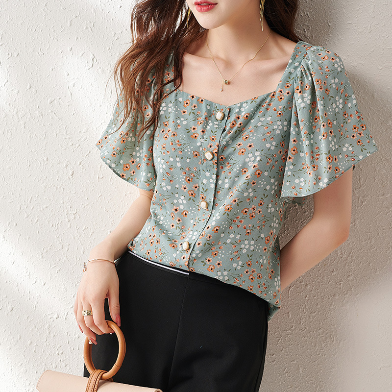 사랑하는 옷 2023 여름 신상품 꽃무늬 쉬폰 여성용 반팔 스타일 셔츠 슈퍼 페어리 달콤한 나이 감소 탑