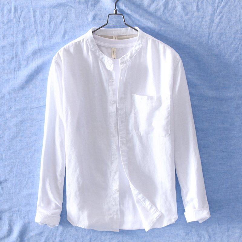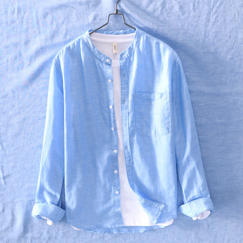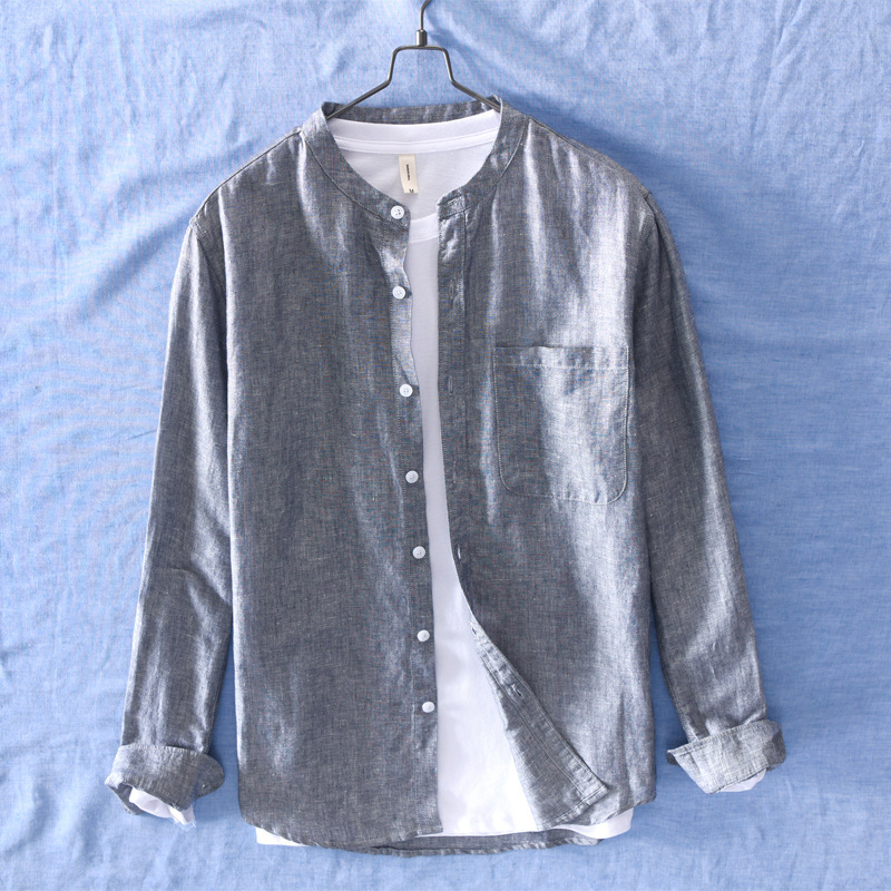 756 일본어 간단한 얇은 통기성 셔츠 남성 린넨 캐주얼 느슨한 단색 긴 소매 셔츠 머리카락의 세대