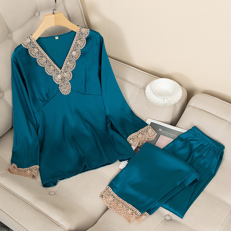 잠옷 여자의 봄과 여름 긴팔 바지 2 피스 아이스 실크 섹시 캐주얼 아웃웨어 세트