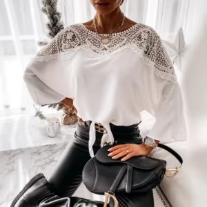 독립 웹사이트 wish Amazon 봄, 가을 신작 긴팔 레이스 셔츠 솔리드 컬러 통근 탑 라운드 넥 셔츠