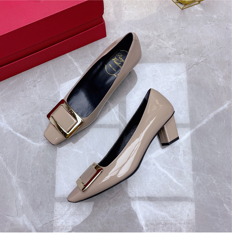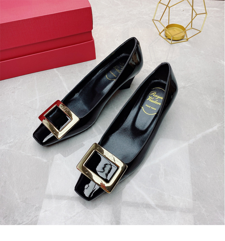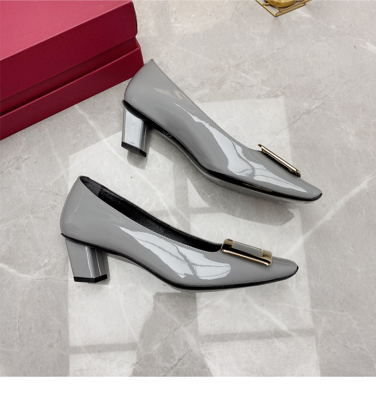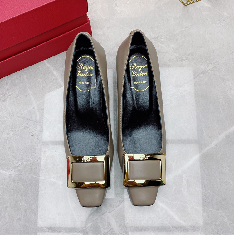 가을 2023 새로운 미드 힐 두꺼운 굽 유행 화이트 스퀘어 토 얕은 입 우아한 메탈 스퀘어 버클 여성용 싱글 레이어 신발스토어 가기