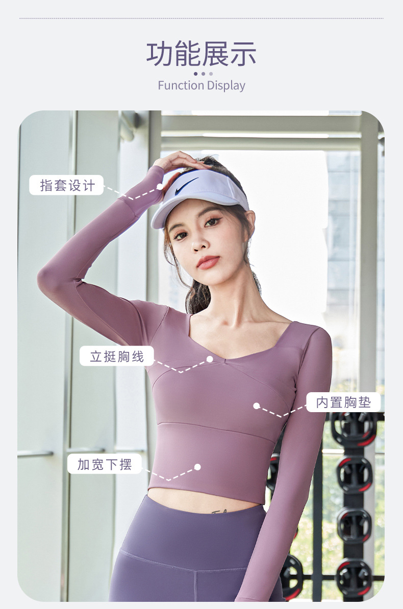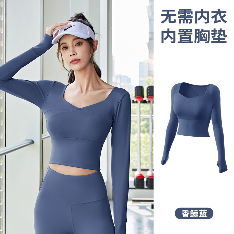 요가 의류 여성용 긴팔 스포츠 탑 꽉 끼는 짧은 배꼽 가슴 패드 크로스 티셔츠 러닝 피트니스 의류스토어 가기