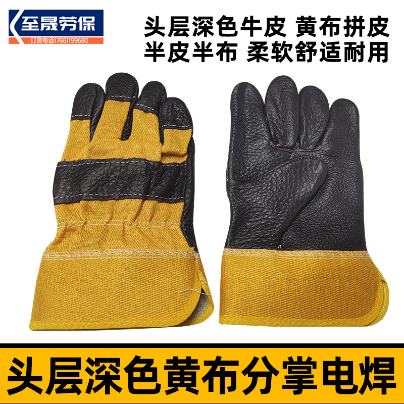 도매 1 층 어두운 가죽 손바닥 칼 노란 천 고무 소매 손 다시 바느질 가구 가죽 반 가죽 용접 장갑
