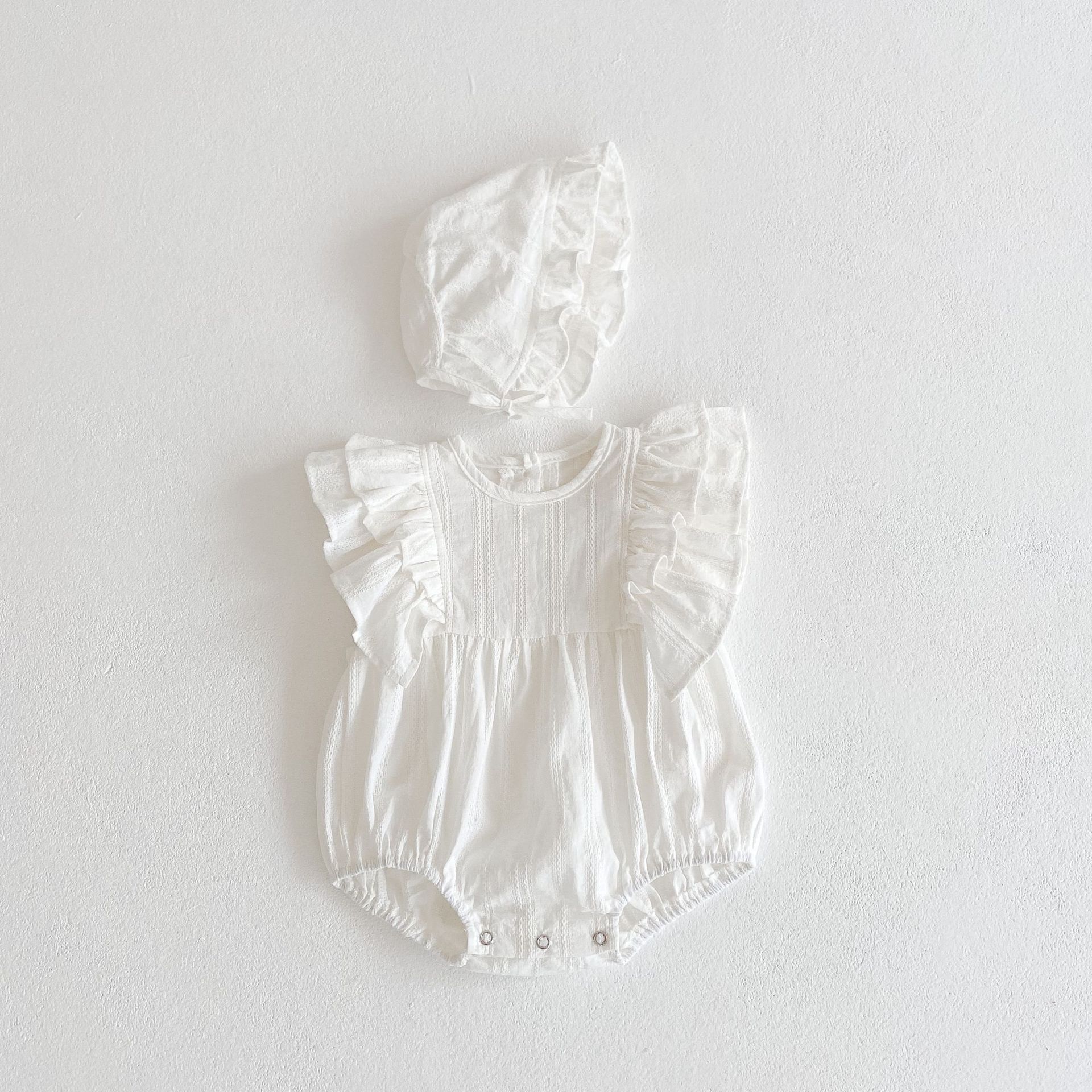 Ins 2025 여름 면 유아 아기 소녀 점프 슈트 플라잉 슬리브 자카드 점프 슈트 romper 무료 모자