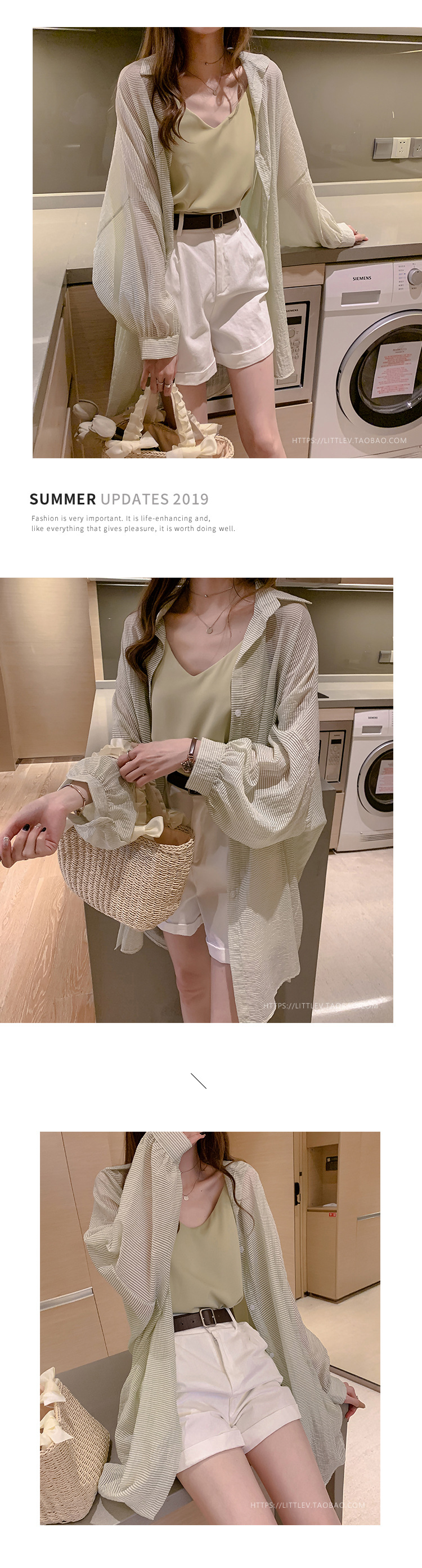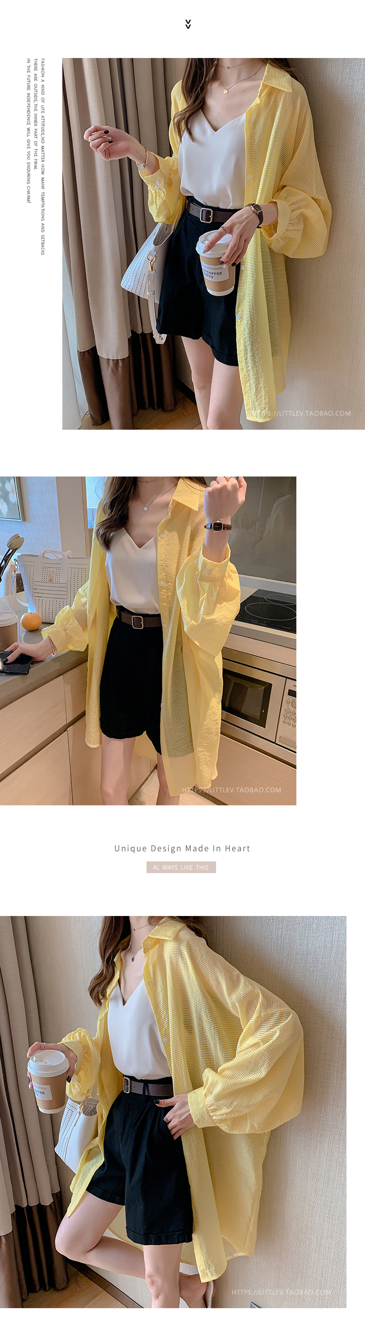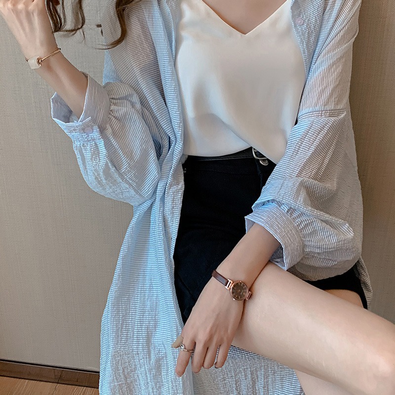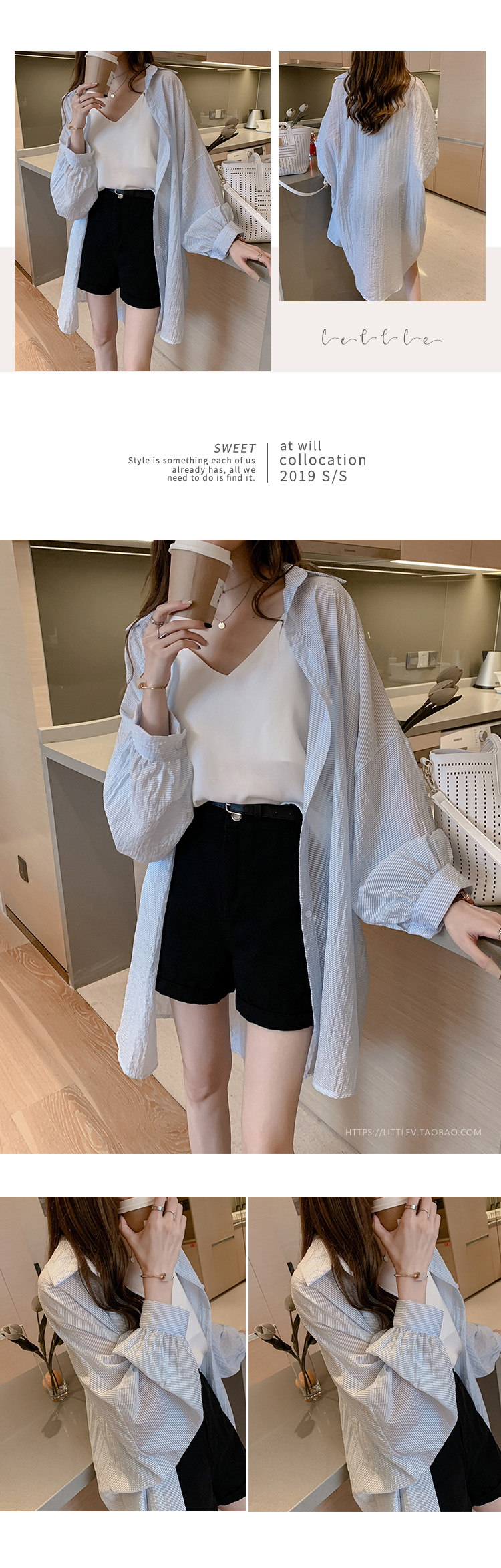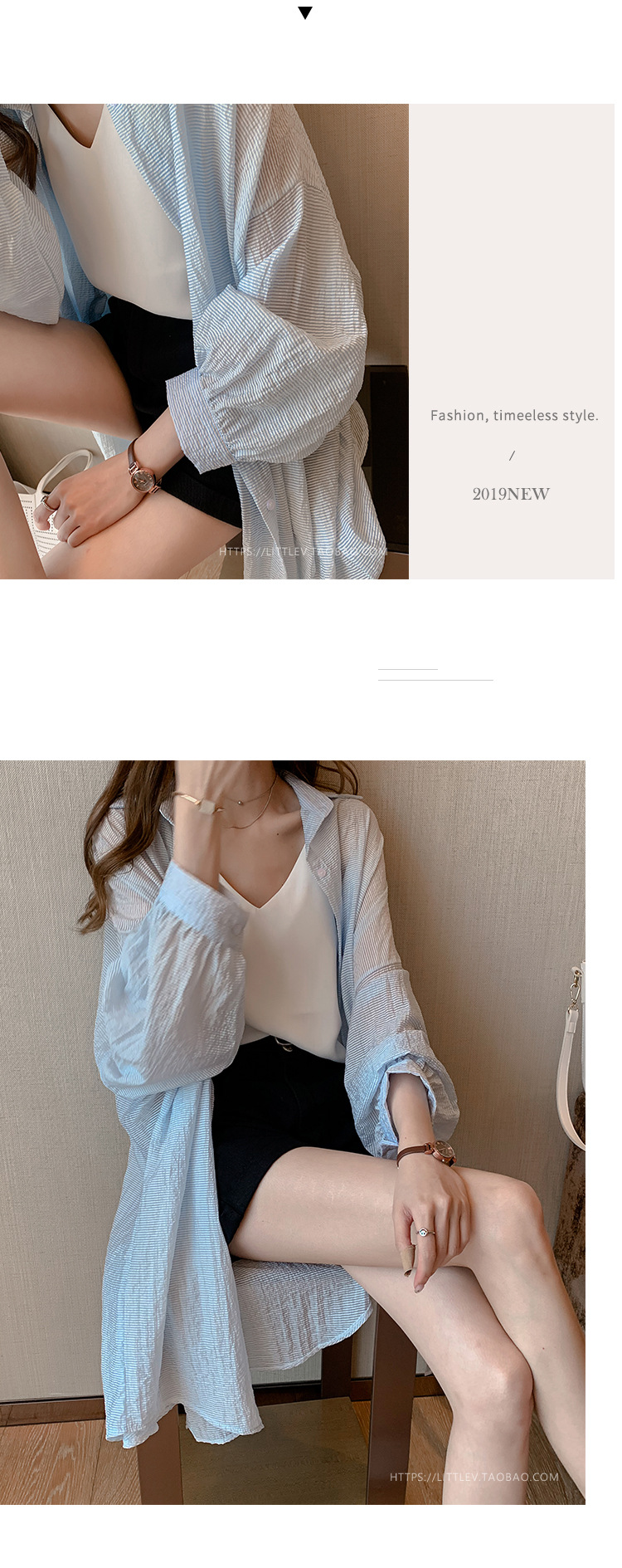 2019 새로운 패션 중간 길이 스트라이프 셔츠 여성용 디자인 센스 틈새 탑 긴팔 자외선 차단제 셔츠 얇은 재킷