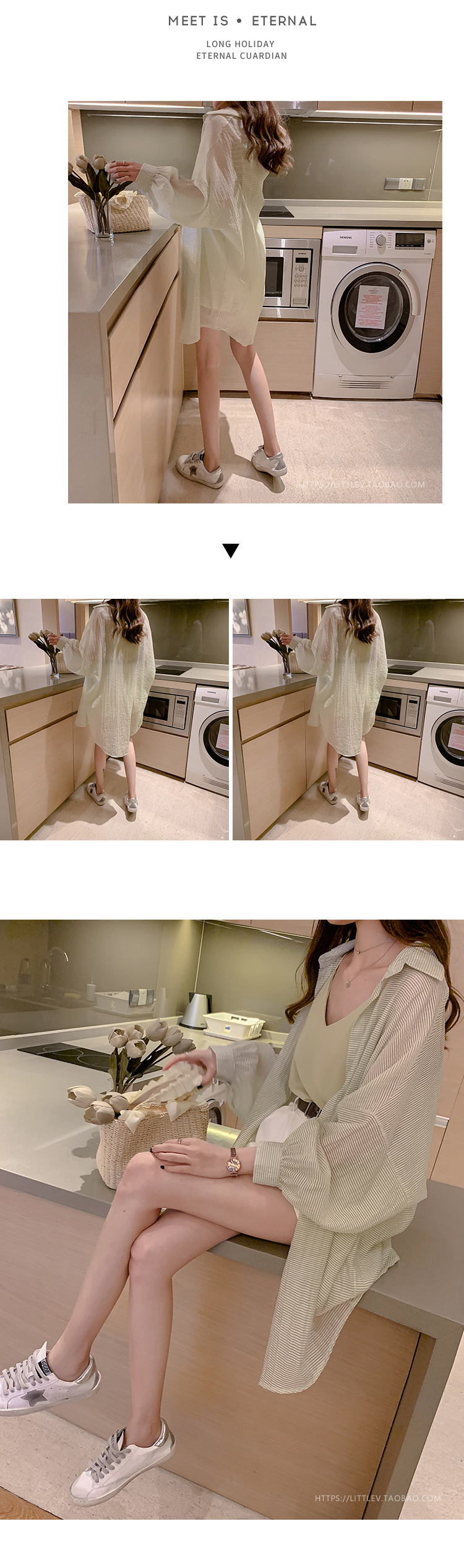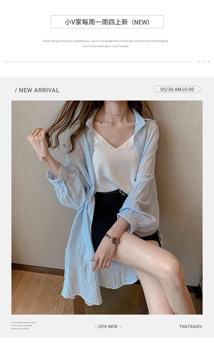 2019 새로운 패션 중간 길이 스트라이프 셔츠 여성용 디자인 센스 틈새 탑 긴팔 자외선 차단제 셔츠 얇은 재킷스토어 가기