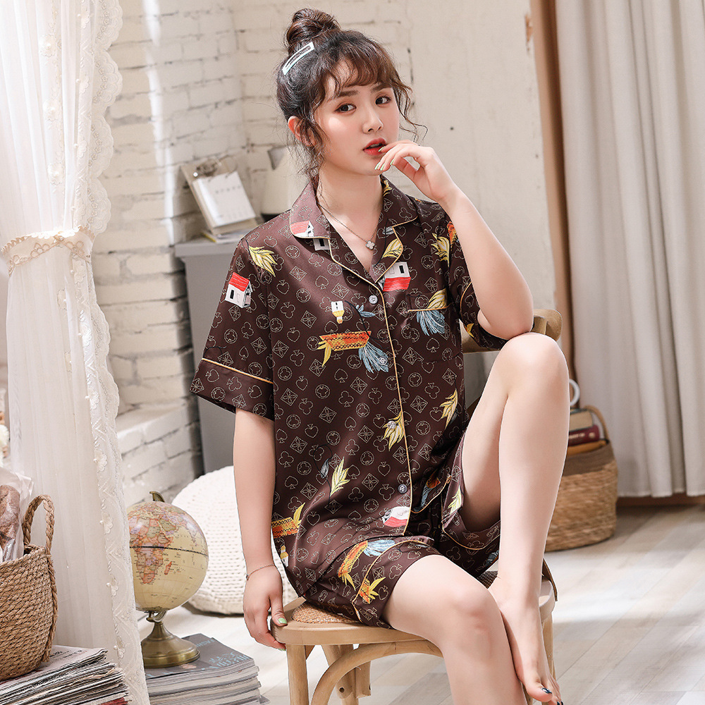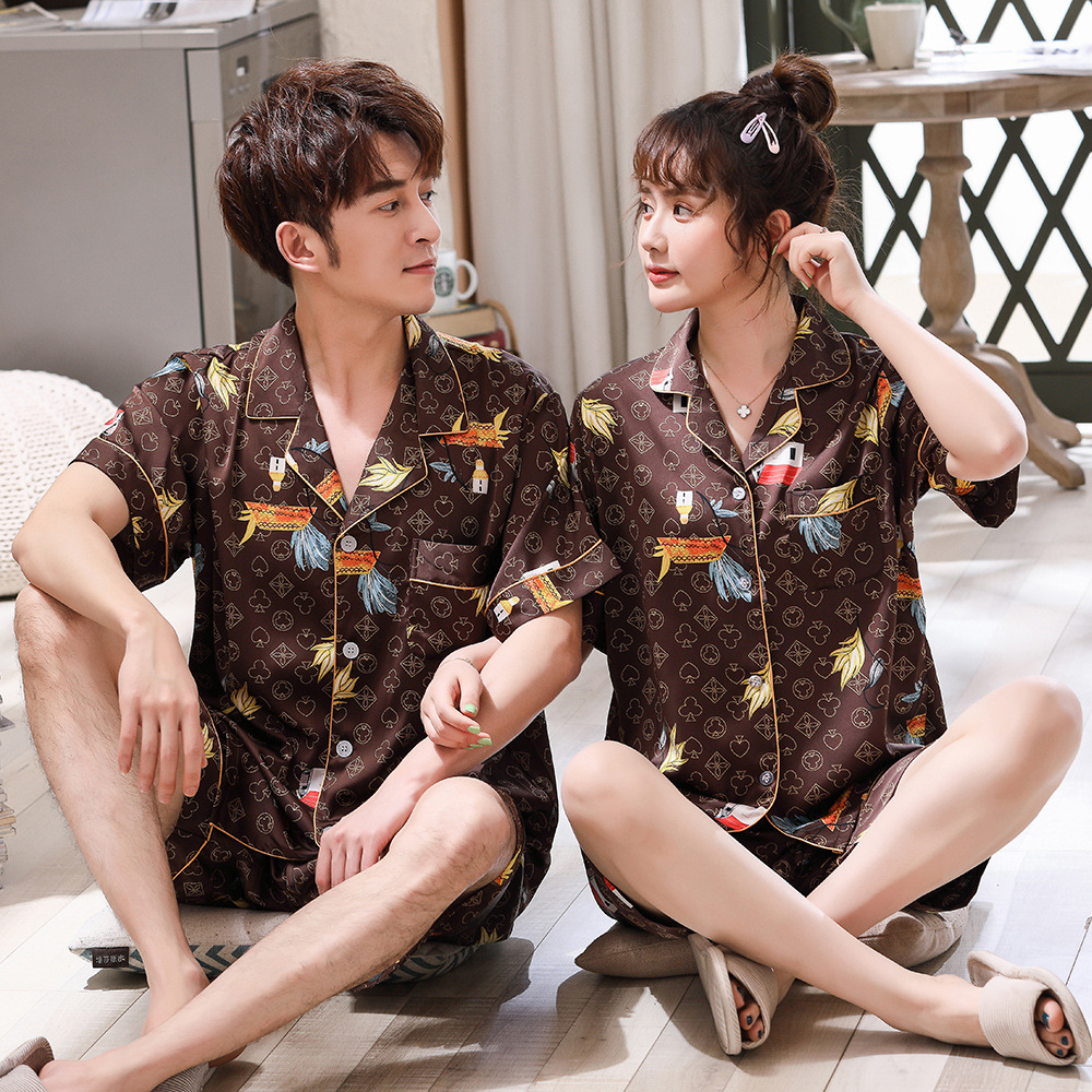2022 여름 새로운 커플 잠옷 여자의 아이스 실크 반팔 패션 인터넷 연예인 유행 가정 의류 세트 남성 제조 업체