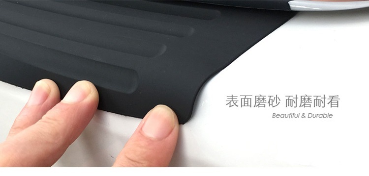 其实目前市面上有金属的防擦条,个人感觉不靠谱,因为比如我们物品后备箱搬运,很容易金属造成划痕,反而难看,橡胶材质就不同了。本款外形类似揽胜后备箱款式,美观简洁大方.