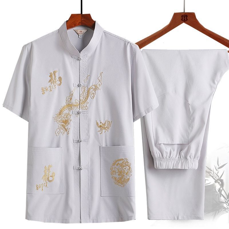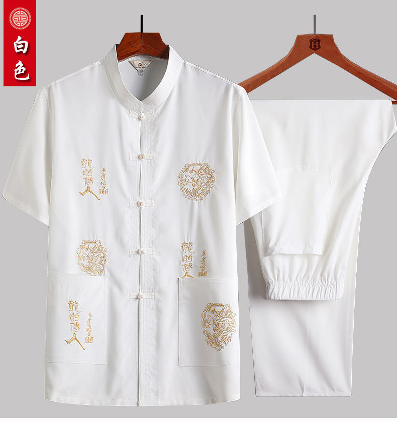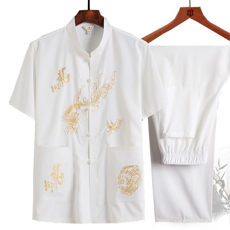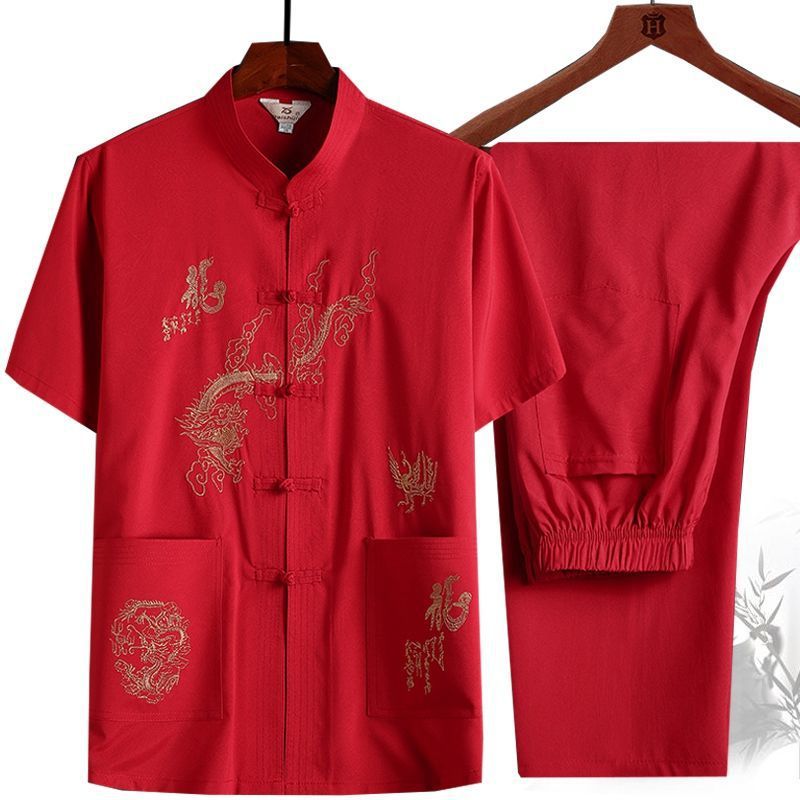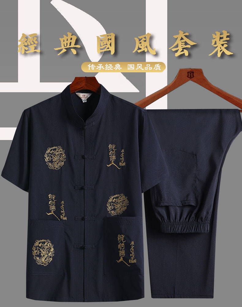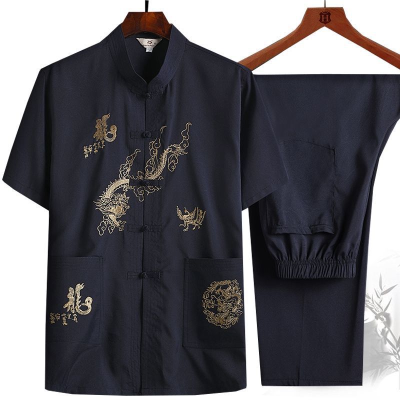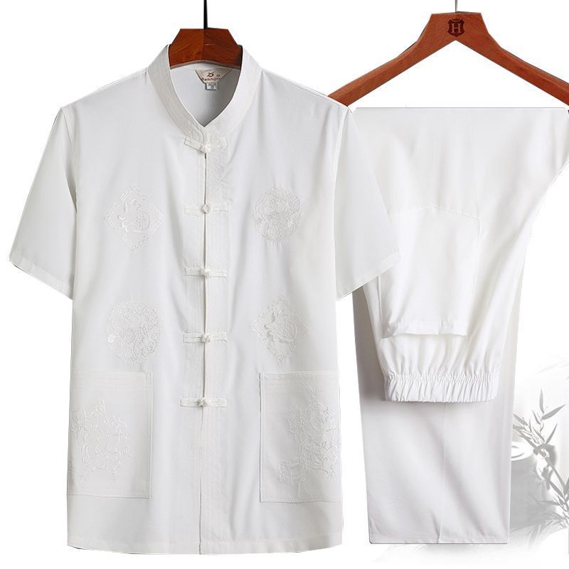 중년 및 노인 여름 세트 당 세트 남자의 반팔 셔츠 자수 아버지 중국 여가 아침 운동 할아버지 세트 Hanfu스토어 가기
